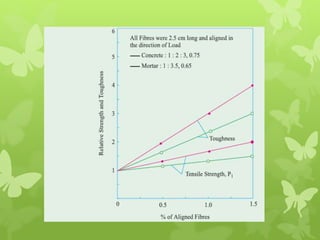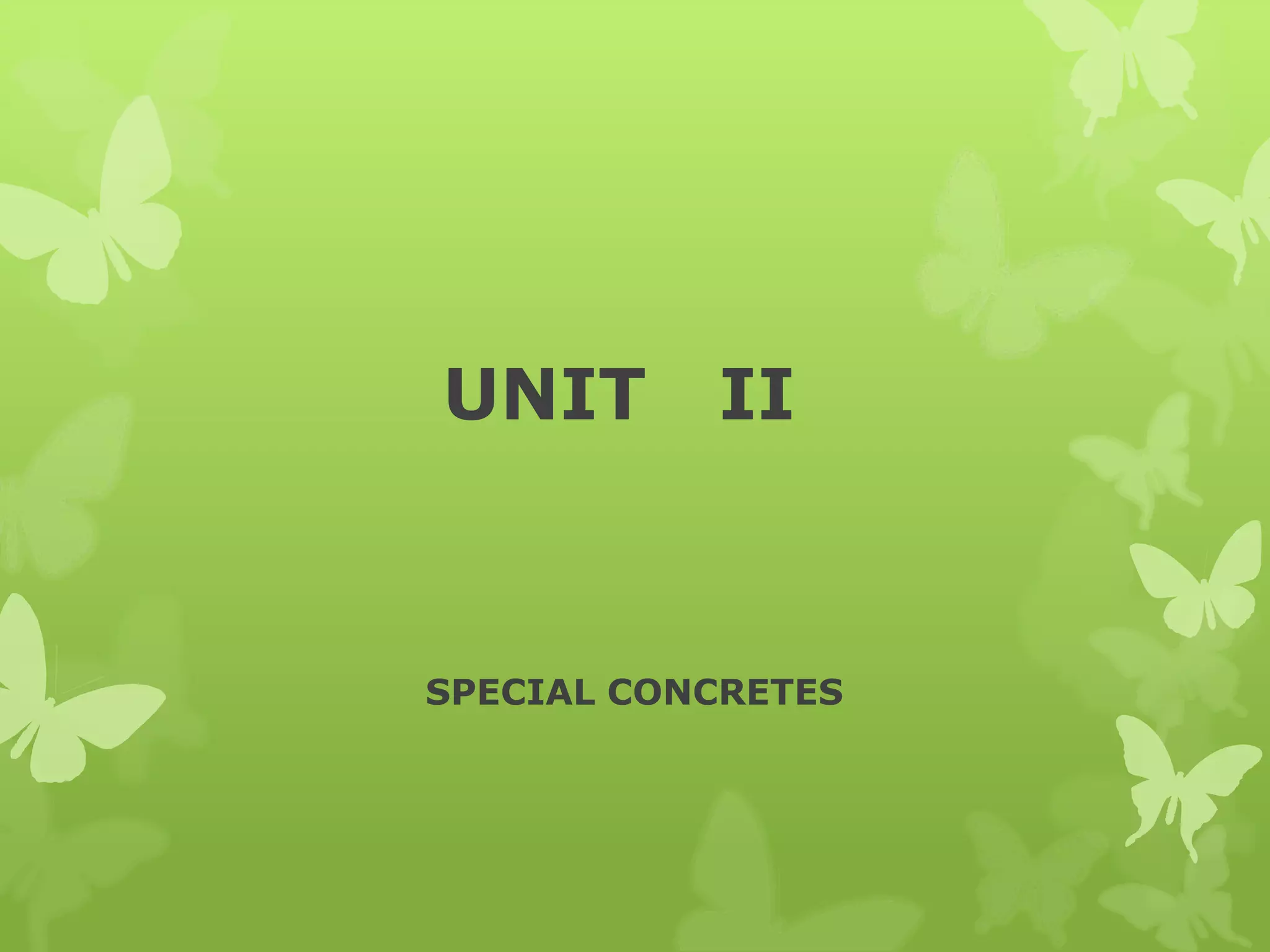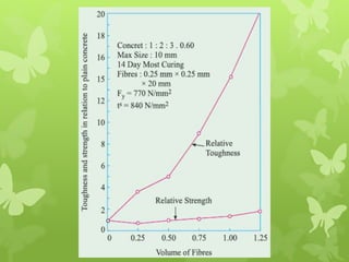 This document discusses different types of special concretes, including fibre reinforced concrete, self-compacting concrete, polymer concrete, high performance concrete, and sulphur concrete. It focuses on fibre reinforced concrete and self-compacting concrete, providing details on their composition, production, properties, and applications. Fibre reinforced concrete is made stronger and tougher through the addition of fibres like steel, glass, and carbon. Self-compacting concrete is able to flow and consolidate under its own weight without vibration, bringing construction benefits like faster placement and improved surface finish.