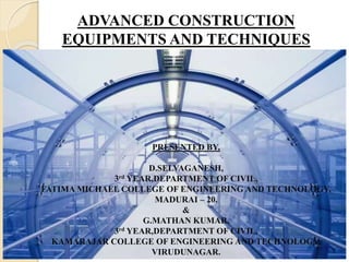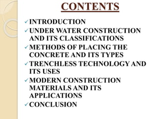 This document discusses advanced construction techniques and modern materials. It describes underwater construction methods like caissons and cofferdams. Trenchless technology techniques for installing pipes are also covered, including pipe jacking, auger boring, and microtunneling. Modern materials presented include fly ash bricks, translucent concrete, liquid granite, carbon nanotubes, and solar panel roofing tiles. The document concludes that these advanced techniques and innovative materials can improve properties, recycling, and make construction more efficient.