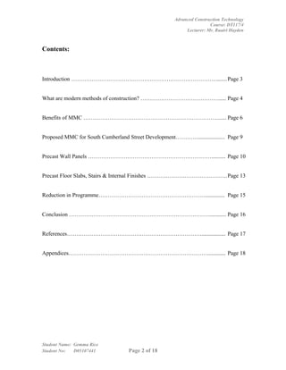 The document proposes using modern methods of construction (MMC) to reduce the construction time of the South Cumberland Street development. Specifically, it recommends using precast concrete wall panels, precast floor slabs and stairs, and spray-on plastering for internal walls. Precast walls can be constructed more quickly and with better quality control than traditional insitu concrete walls. Electrical conduits and connections for cladding can be cast into the precast walls in the factory. Similarly, precast floors and stairs can be installed faster than poured concrete components. Using MMC is expected to significantly reduce the overall construction schedule while maintaining quality for the client.