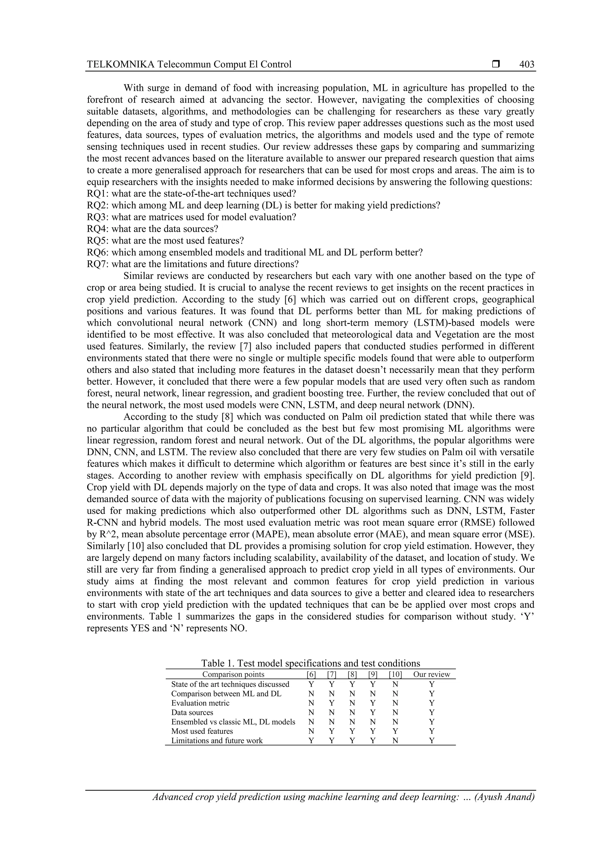 The advancement of machine learning (ML) and deep learning (DL) techniques has significantly improved crop yield prediction, making it more accurate and reliable. In this review, the implementation of ML and DL algorithms for crop yield prediction is thoroughly investigated, focusing on their crucial role in enhancing crop productivity. Along with ML and DL algorithms examine, the review analyses the use of remote sensing technologies, such as satellite and drone data, in providing high-resolution inputs essential for accurate yield predictions. The study identifies the state of art algorithms, most used features, data sources and evaluation metrics, providing a comparison of ML and DL. The findings indicate that DL models are more effective with large datasets, while ML models remain robust for smaller datasets. The future directions are proposed to develop the generalised models for different crops and regions. The review aims to assist researchers by summarising state of art techniques and identifying the present.