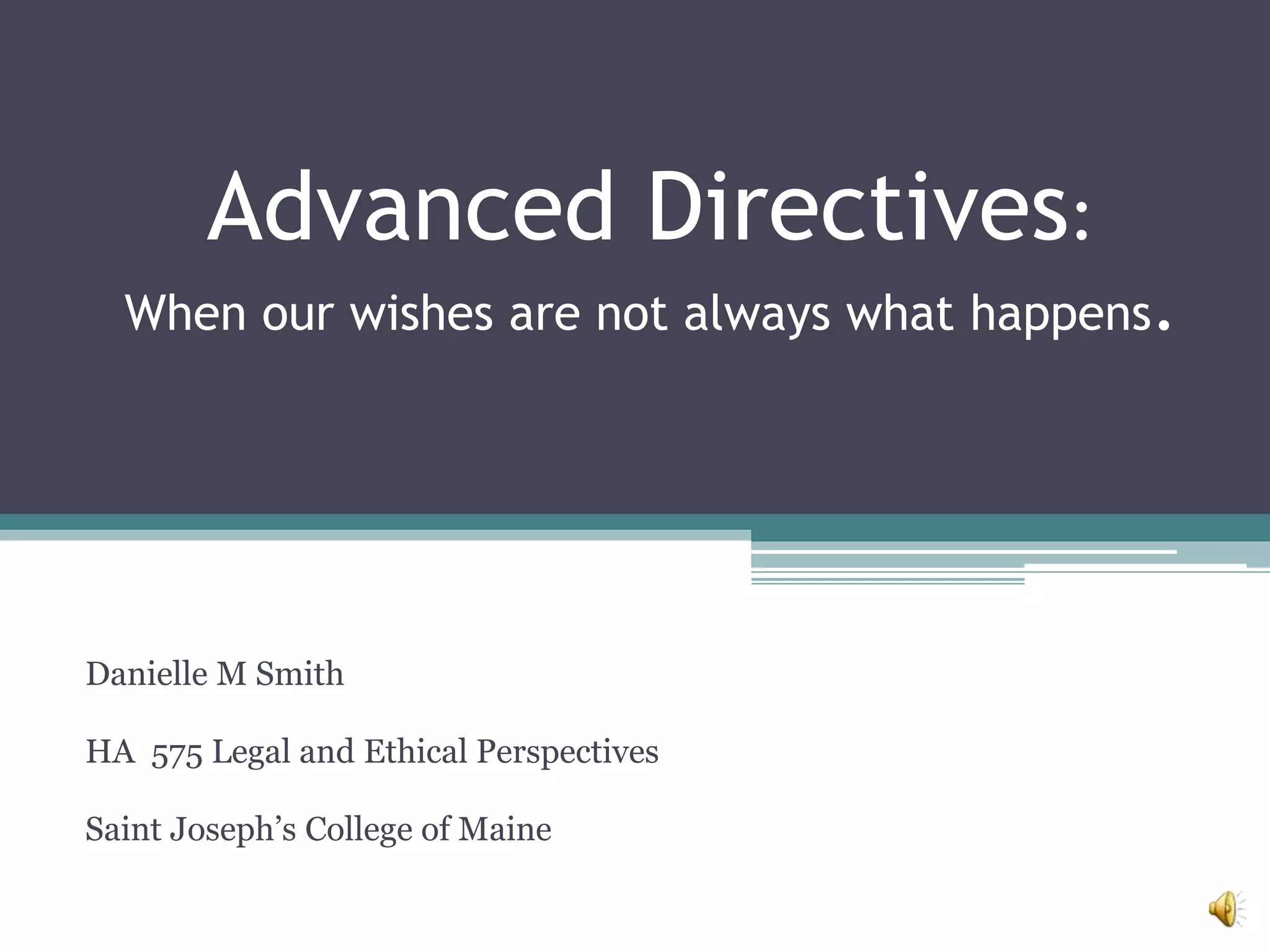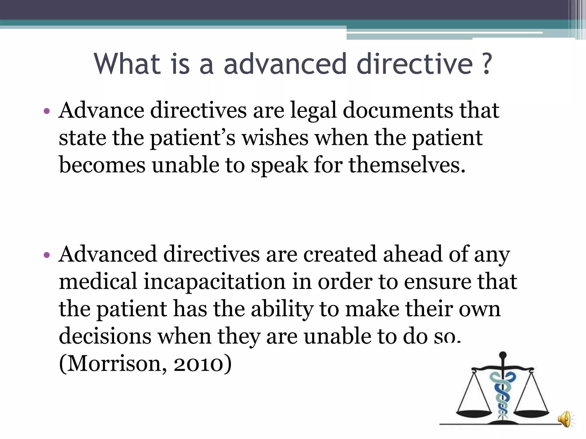 Advanced directives are legal documents that specify a person's medical wishes in case they become unable to make decisions themselves. There are several types, including living wills, durable power of attorney, and health care proxies. A living will outlines preferences for life-sustaining treatments. A durable power of attorney designates someone to make medical and financial decisions. Health care proxies appoint a surrogate decision maker. The Patient Self-Determination Act protects patient rights regarding advance directives and medical decision making. However, ethical issues can arise regarding competency determinations and disagreements between patients, families and medical staff over treatment plans.