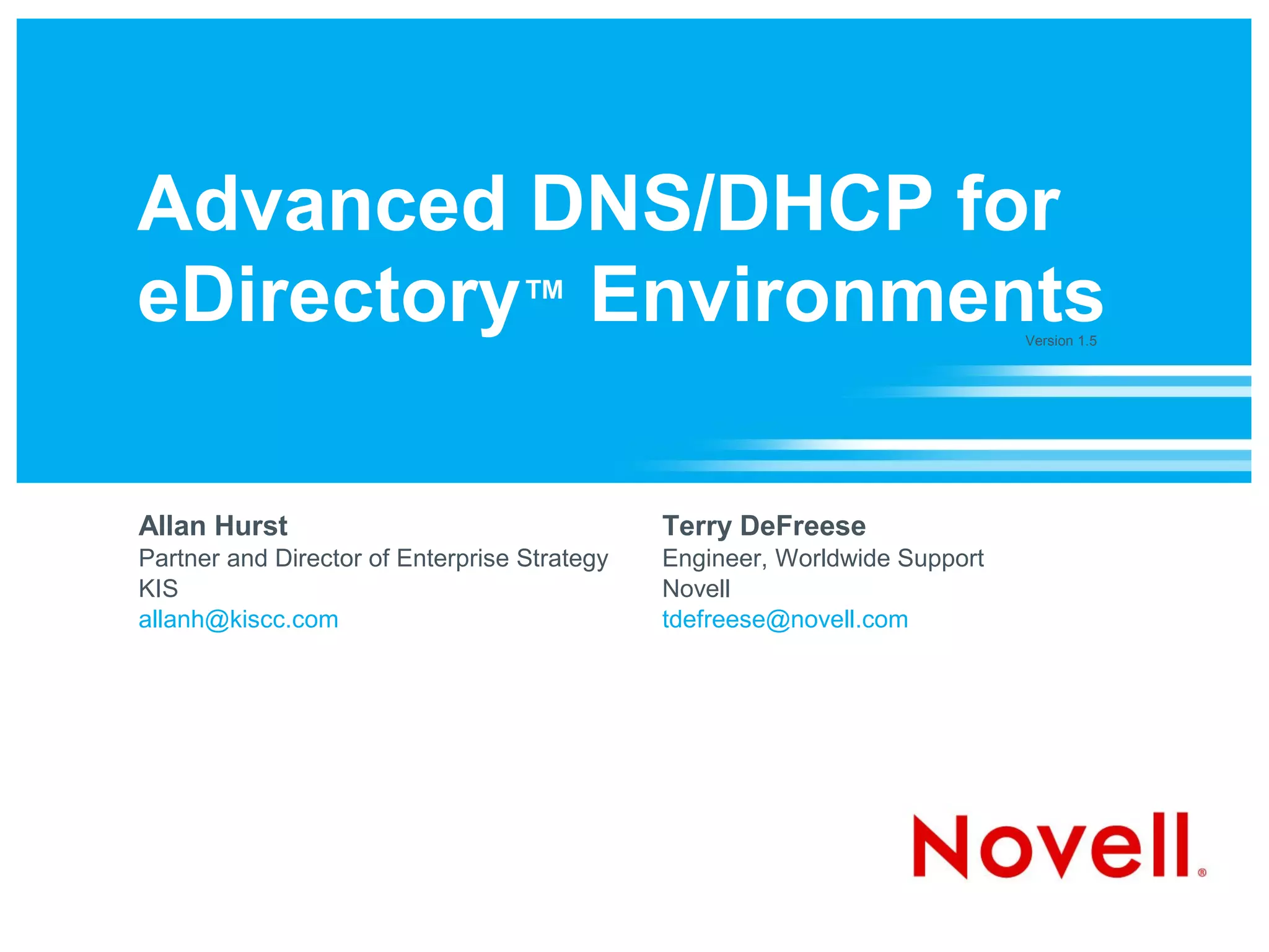 The document discusses advanced DNS and DHCP management within eDirectory environments, particularly focusing on Novell's Open Enterprise Server 2 (OES2). It addresses common issues and configurations for network managers transitioning from Novell to Linux-based systems, emphasizing the importance of correctly setting DNS suffixes for proper name resolution. The session aims to provide insights into troubleshooting DNS problems and ensuring seamless integration of DNS/DHCP services in mixed network environments.