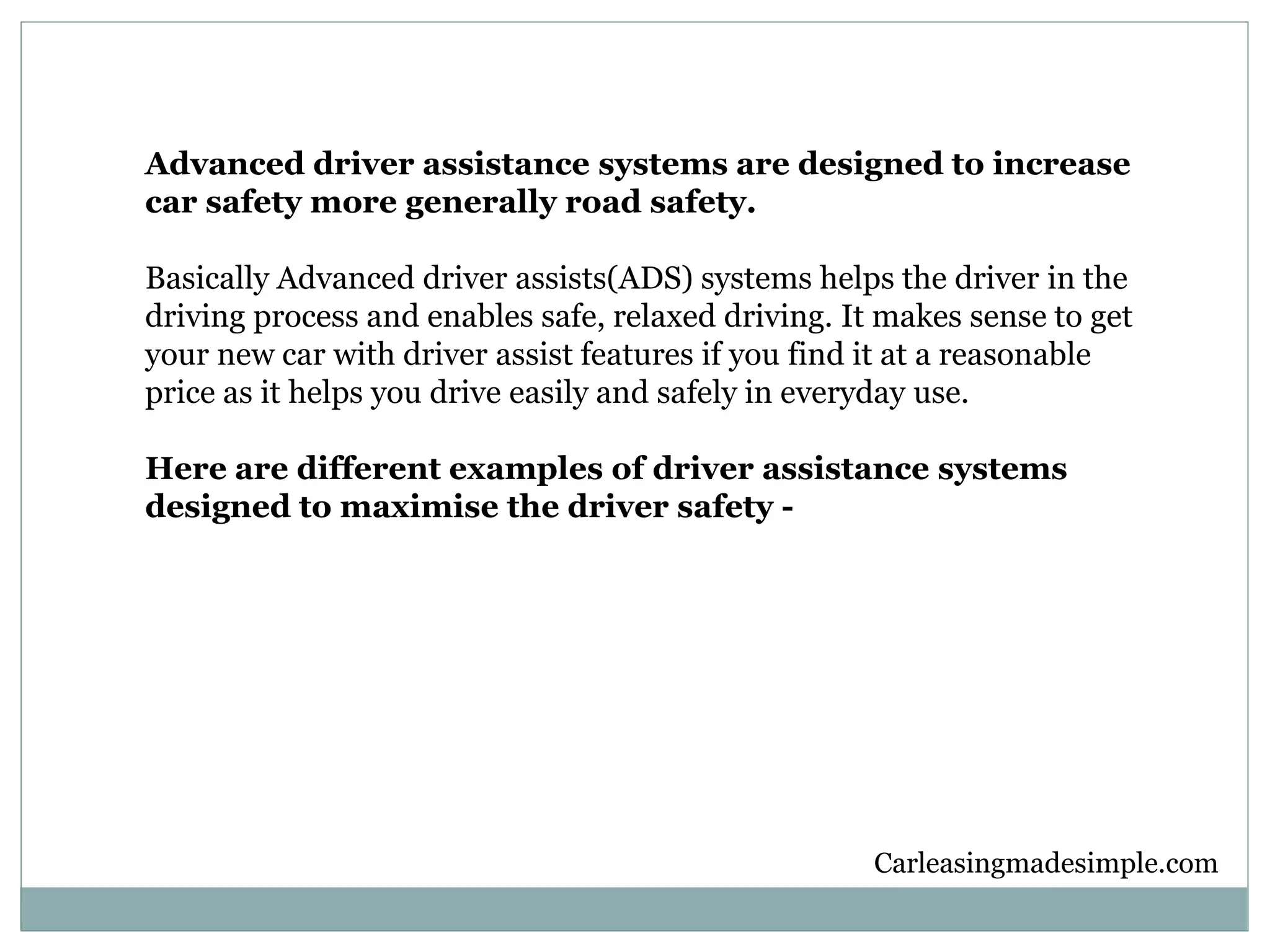 Advanced driver assistance systems are designed to increase car safety and road safety overall. They help the driver in the driving process to enable safe and relaxed driving. Some examples of driver assistance systems that maximize safety include antilock braking systems, adaptive cruise control, blind spot detection, driver drowsiness detection, electronic stability control, emergency braking systems, hill descent control, intelligent speed assistance, lane departure warning systems, pedestrian detection, rear cross traffic alert, and traffic sign recognition. These systems alert drivers to hazards, help maintain safe distances and speeds, and in some cases automatically apply brakes to avoid collisions.