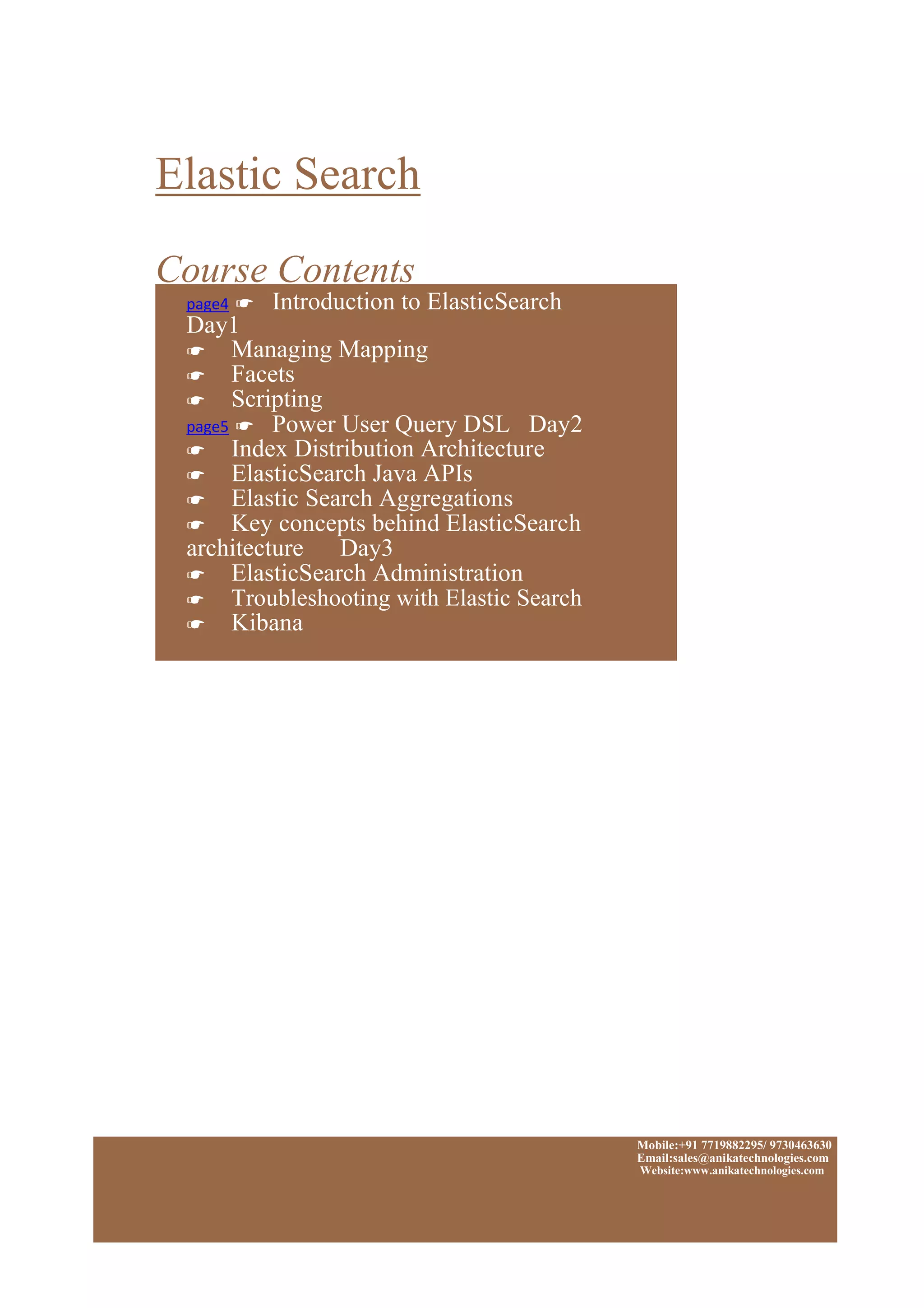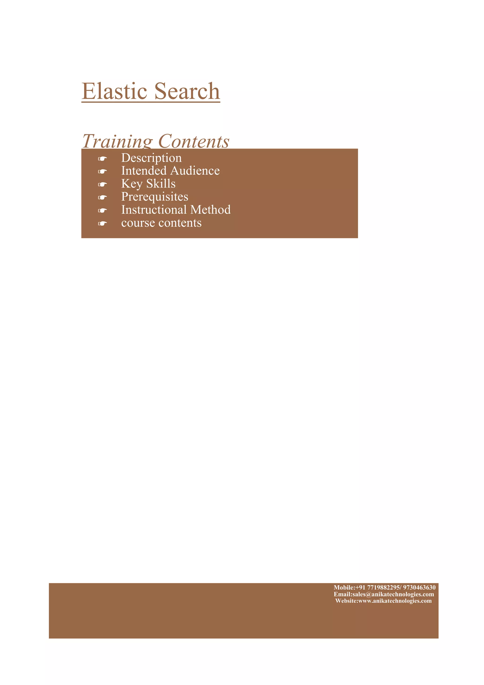 The document describes an Elastic Search training course that covers topics like managing mappings, facets, scripting, indexing distribution architecture, Java APIs, aggregations, administration, and troubleshooting. The 3-day course is intended for programmers, engineers, and networking specialists and uses lectures, demonstrations, and a case study to teach students how to build search applications with Elastic Search.