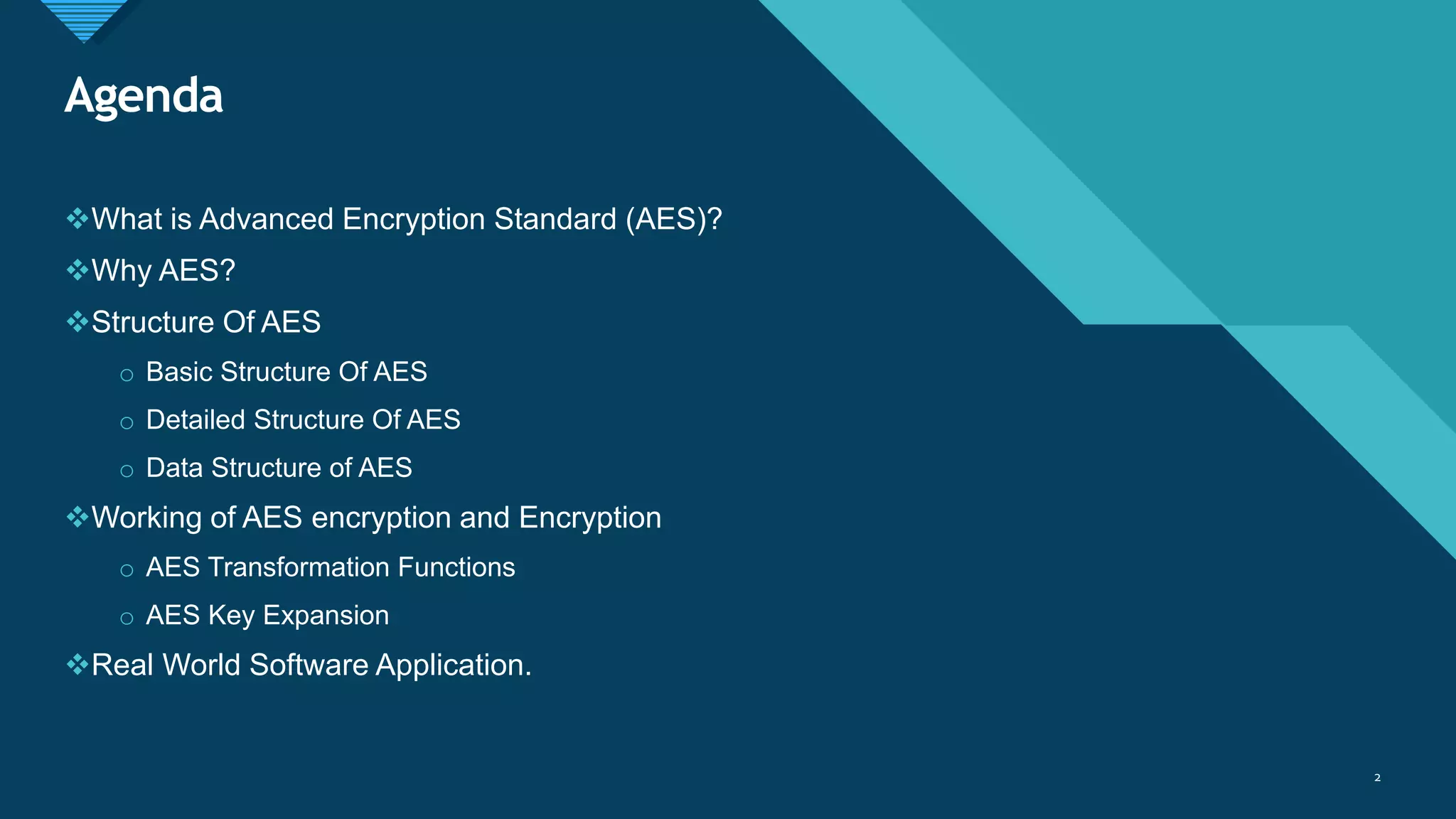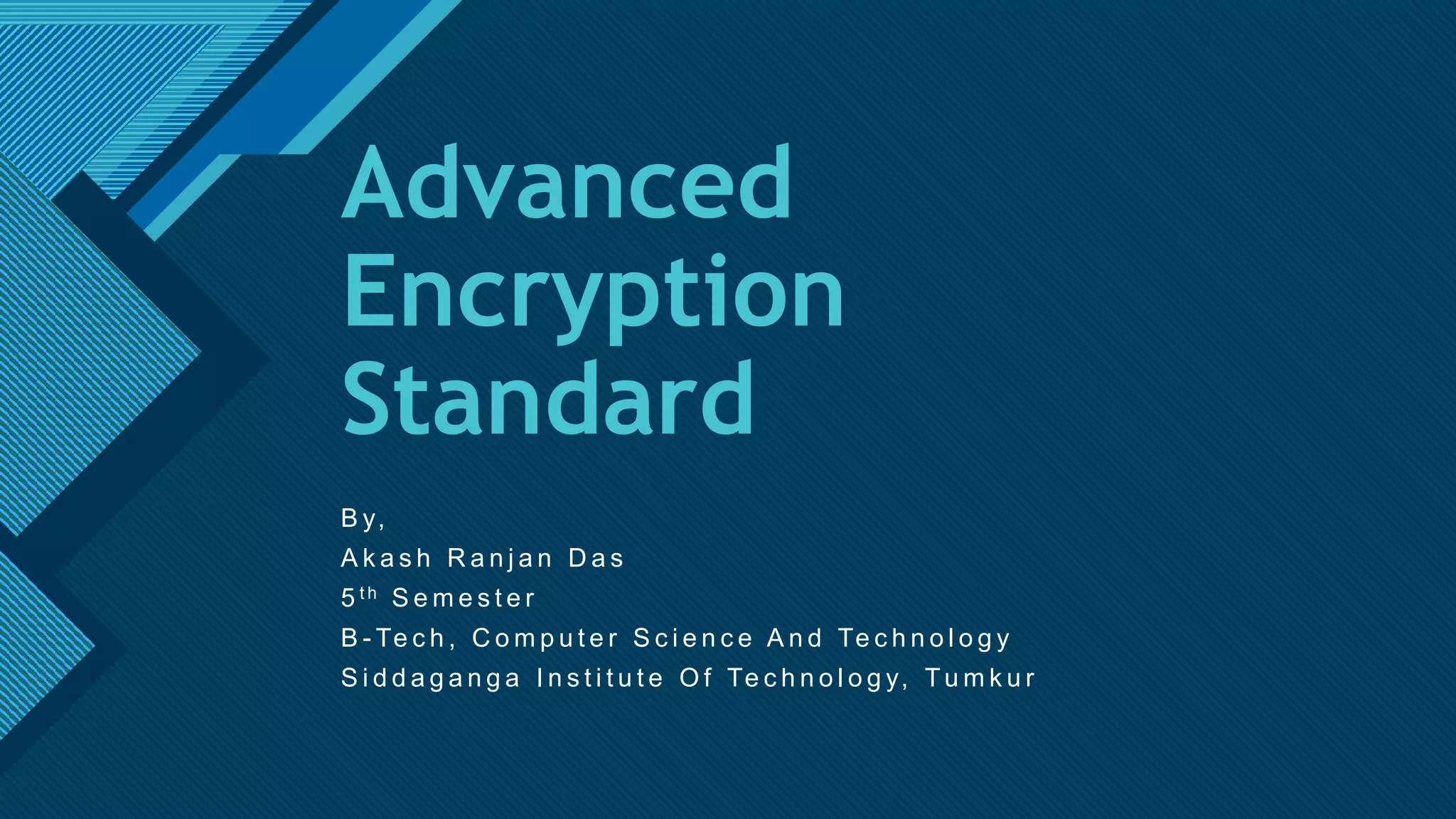 The document provides an overview of the Advanced Encryption Standard (AES), a symmetric block cipher adopted by the US government for protecting classified information and widely used for encrypting sensitive data globally. It compares AES with the previous Data Encryption Standard (DES), emphasizing AES's greater security and structure, which includes processes like key expansion and various transformation functions. Additionally, real-world applications of AES, particularly in end-to-end encryption for chat systems like WhatsApp, underline its importance in modern cybersecurity.
