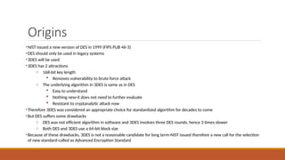 •Because of these drawbacks, 3DES is not a reasonable candidate for long term-NIST issued therefore a new call for the selection