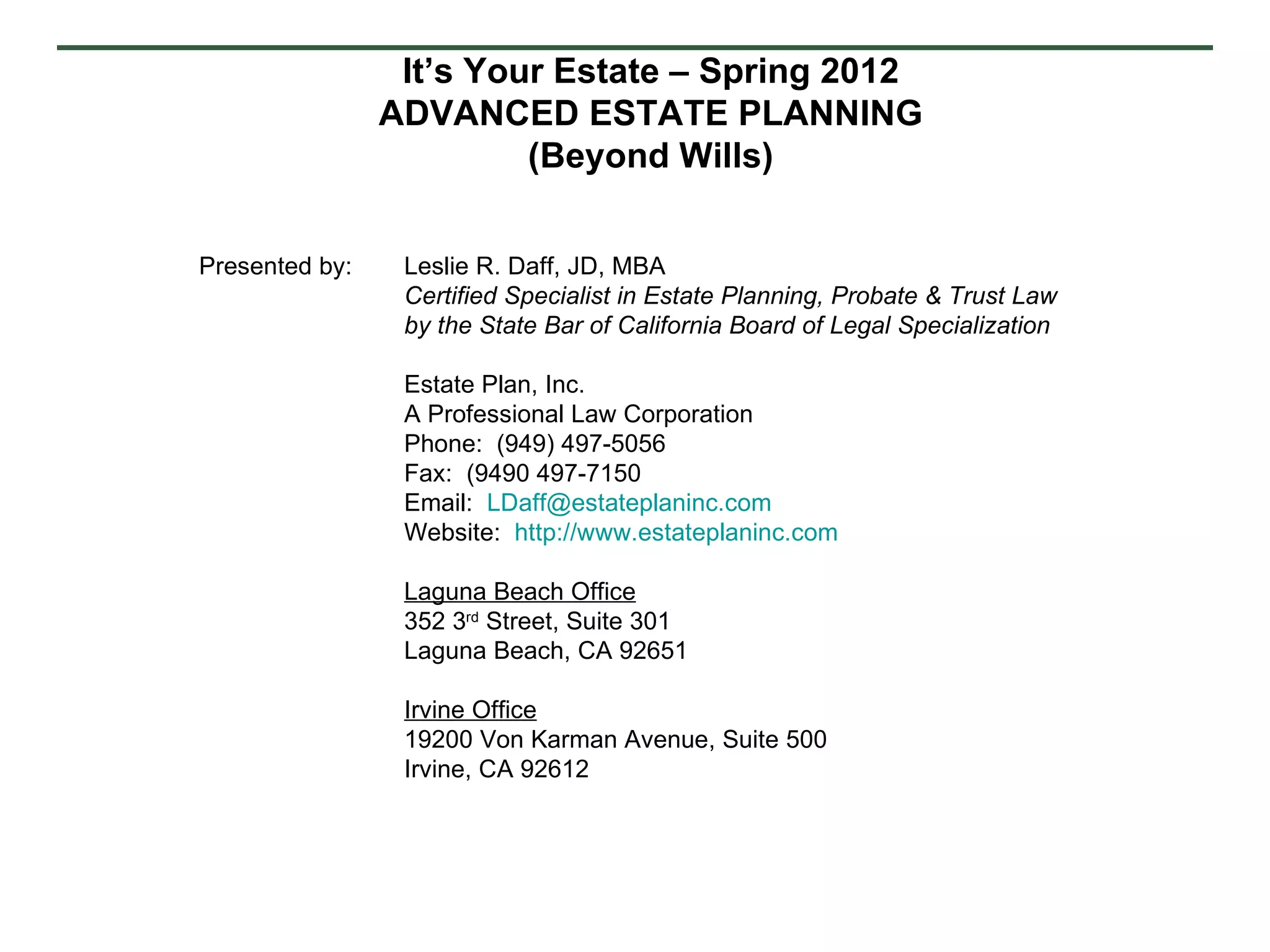 The document presents advanced estate planning strategies beyond traditional wills, focusing on various types of trusts, including revocable and irrevocable trusts, to avoid probate and manage assets effectively. It outlines the costs associated with probate in California, ways to avoid these fees, and benefits of utilizing living trusts, such as avoiding court involvement and privacy in asset distribution. Additionally, the document discusses tax implications, various trust types for special situations, and strategies for gifting and asset protection.