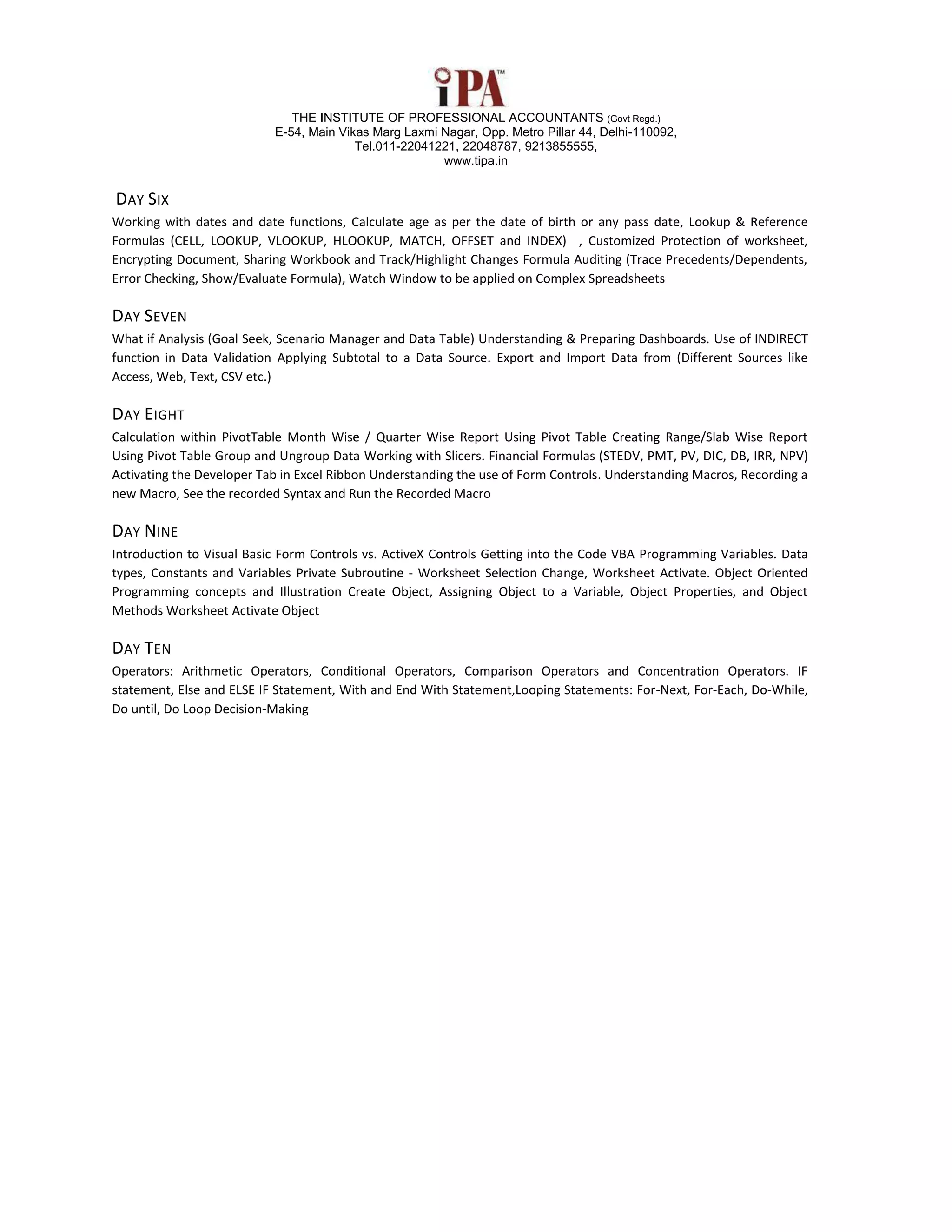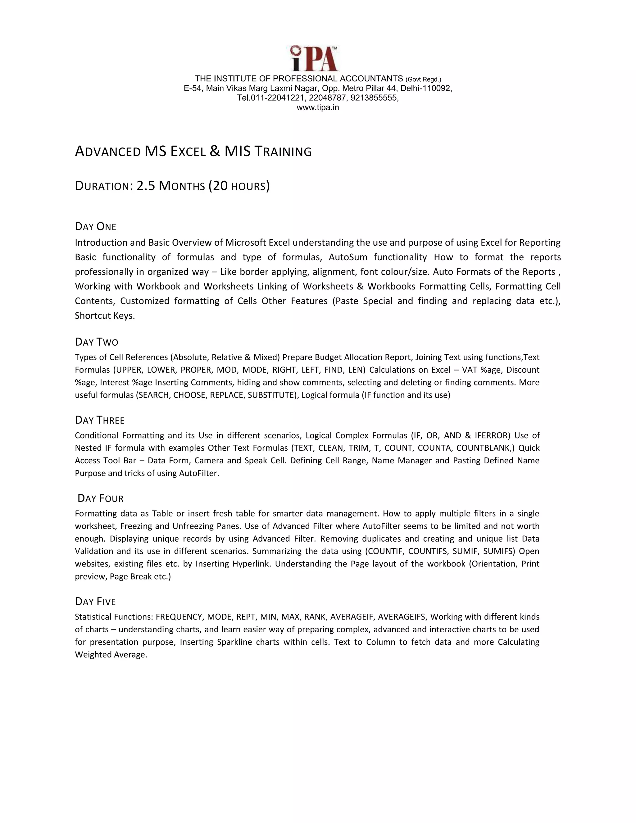 The document outlines a 2.5-month training program on advanced MS Excel and MIS, including topics such as formulas, data formatting, and workbook management. Each day covers specific content, from basic Excel functionalities to advanced topics like VBA programming and pivot tables. Participants will learn practical skills for data analysis, report creation, and automation within Excel.