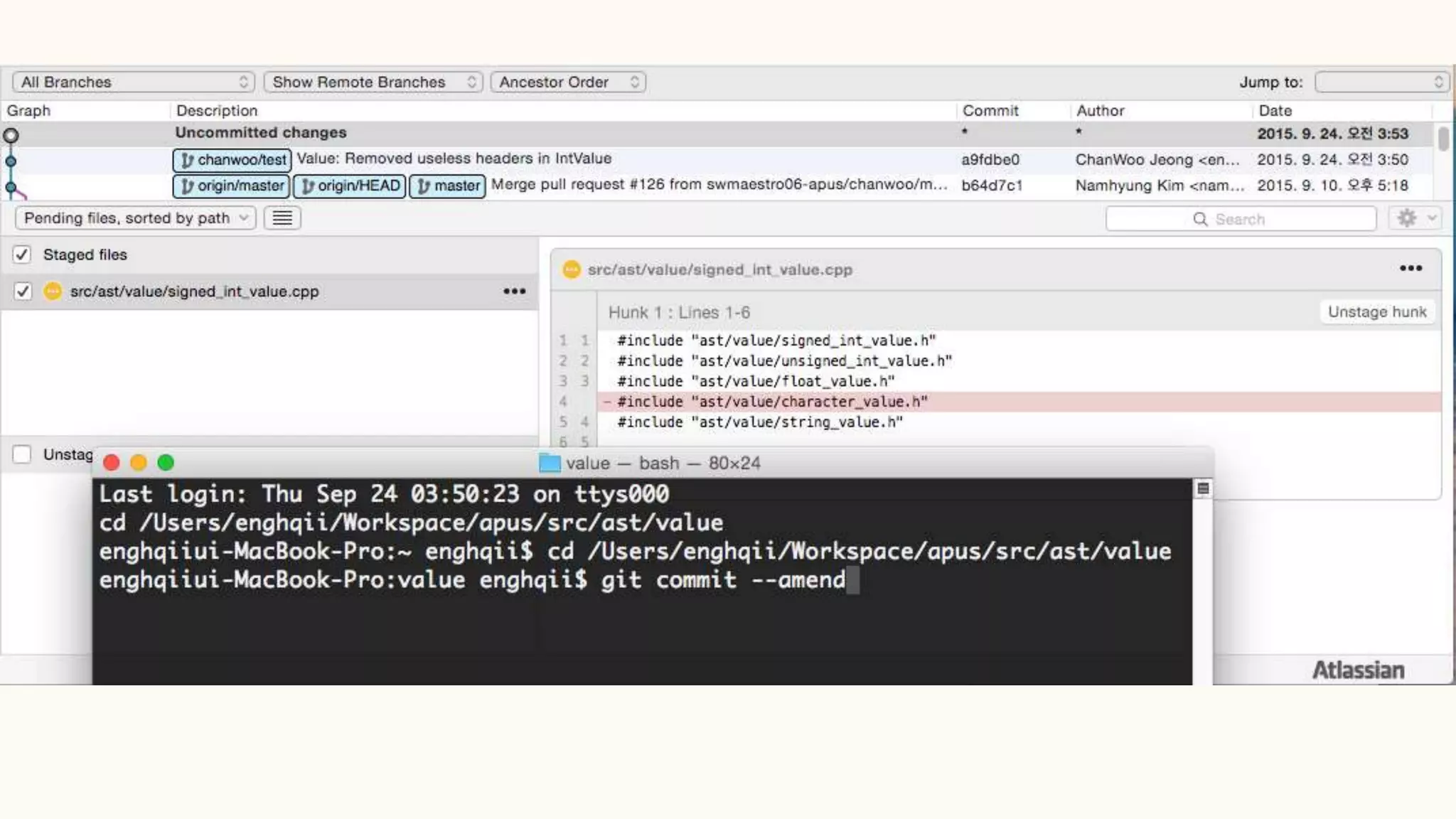 제가 chanwoo/test라는 브랜치를 만들어서 몇가지 쓸모없는 헤더파일을 지우는 커밋을 만들었다고 쳐요,