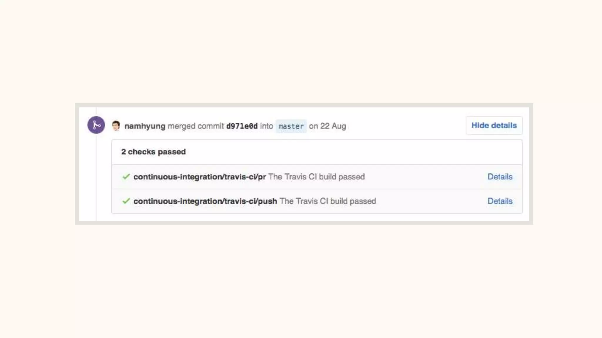 push 된 커밋들은 Travis 빌드 테스트를 통과해야 pull-request를 보낼 수 있다
