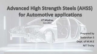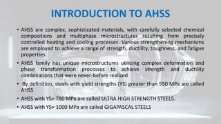 This document provides information on advanced high strength steels (AHSS) used in the automotive industry. It defines AHSS as steels with yield strengths over 550 MPa and discusses various strengthening mechanisms employed. Different types of AHSS are described, including dual phase steels, ferritic bainitic steels, and complex phase steels. Their microstructures and properties are summarized. Key factors for material selection like crash performance, stiffness, and formability are also outlined. The document provides an overview of the evolution of steels in the automotive industry to enable lightweight design through improved strength-ductility combinations realized by AHSS.