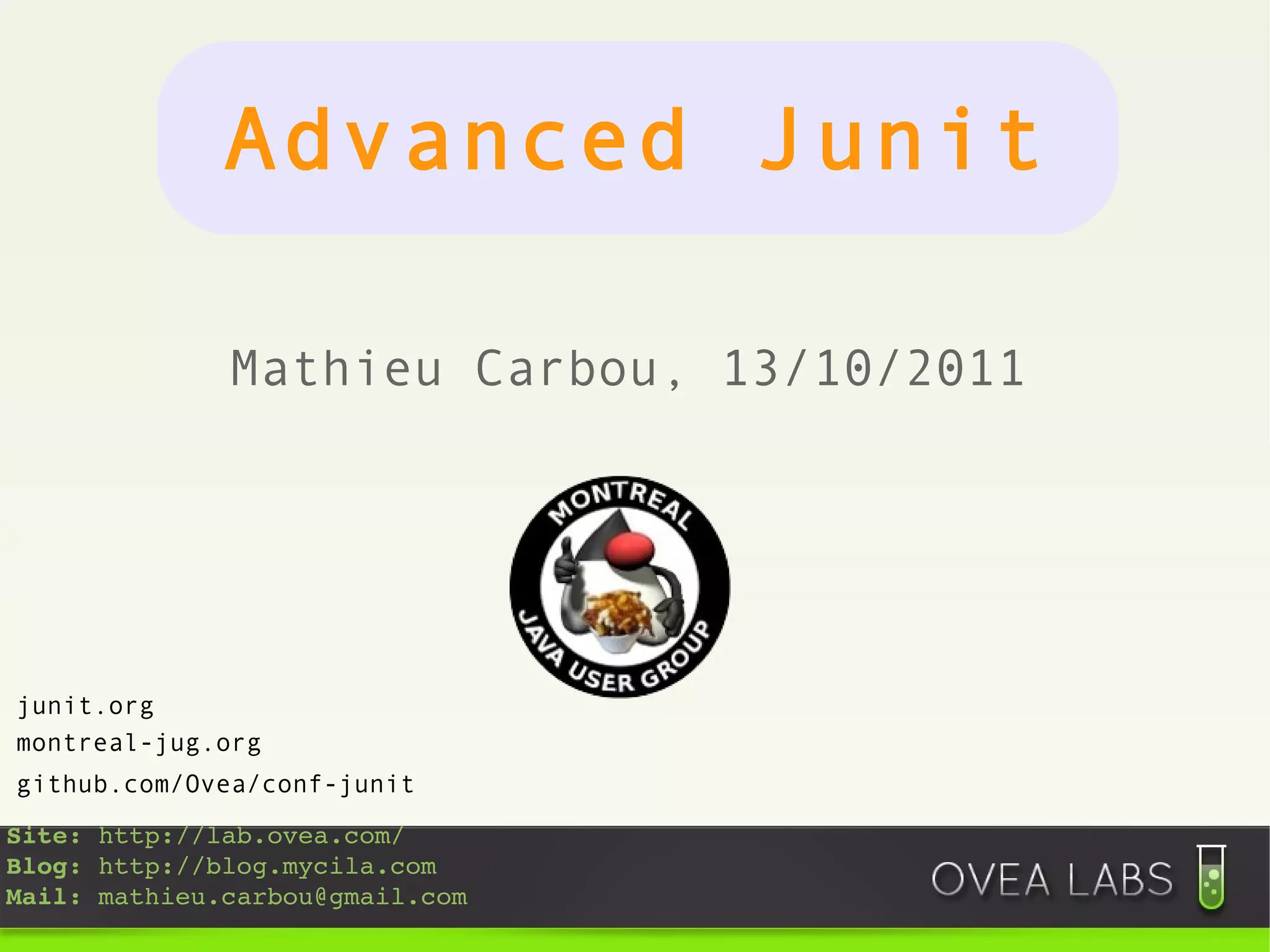 This document summarizes advanced features in JUnit, including: 1. It discusses features like @ClassRule and @Rule in JUnit advanced, which allow implementing custom rules for tests. 2. It mentions experimental features in JUnit like the Enclosed runner, which allows grouping tests into logical blocks. 3. It provides links to resources on Mockito, a mocking framework, comparing it to other mocking frameworks like EasyMock and JMock. Mockito allows stubbing and verifying method calls on mock objects.