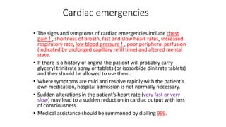 The document outlines the management of cardiac emergencies and trauma in general practice, detailing signs, symptoms, and appropriate responses for conditions like myocardial infarction. It emphasizes the importance of immediate medical assistance, assessing and managing airway, breathing, circulation, disability, and exposure in trauma care. The protocols include the use of medications, oxygen administration, and effective communication with receiving hospitals to improve patient outcomes.
