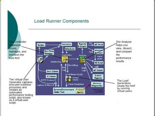 - The components of LoadRunner including VuGen for recording scripts, the Controller for managing tests, and Analysis for reporting.