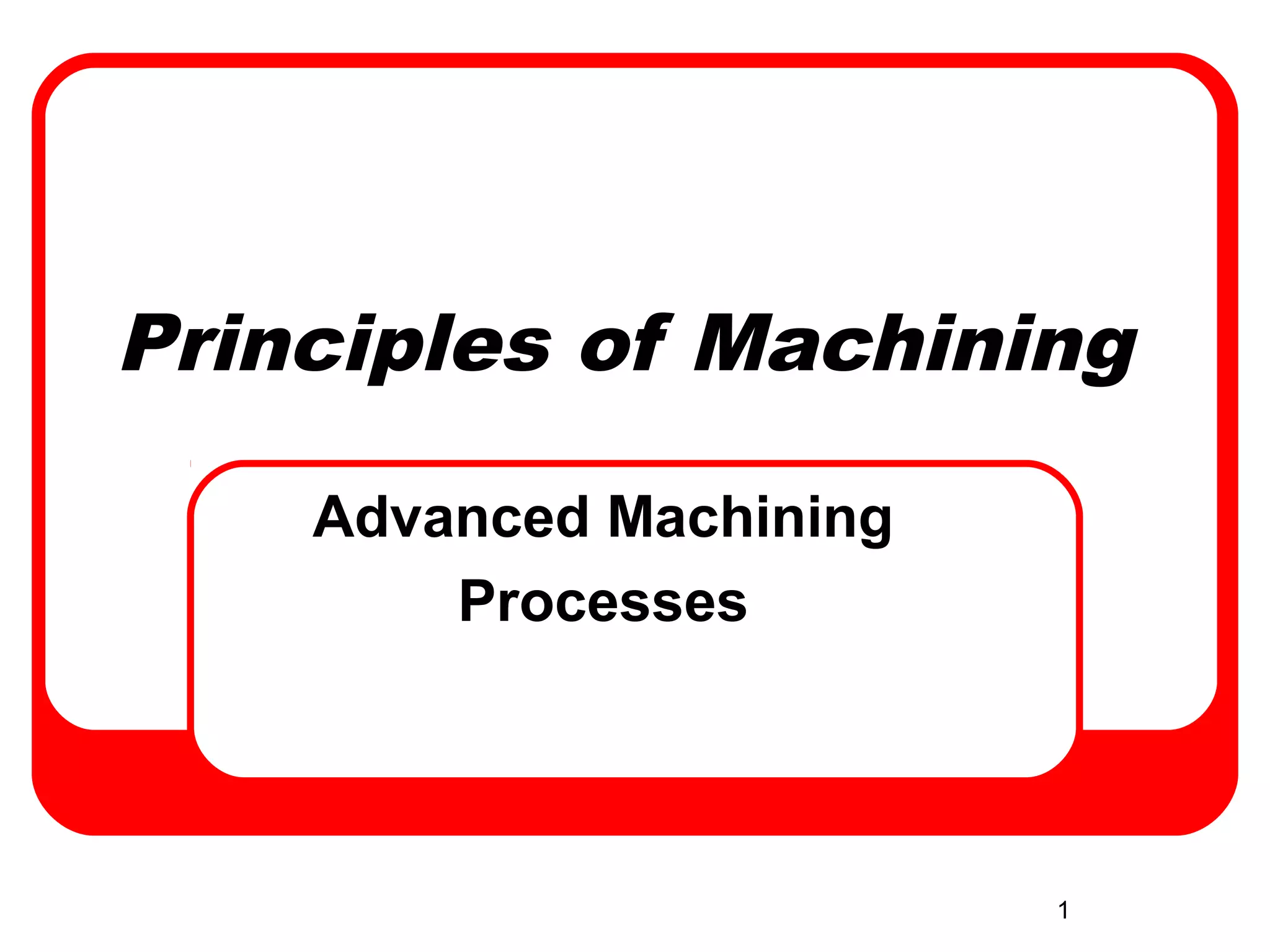 This document discusses advanced machining processes, which utilize chemical, electrical, or high-energy beams to machine materials that cannot be processed through traditional machining methods. It describes 10 common types of advanced machining, including chemical machining, electrochemical machining, electrical discharge machining, laser beam machining, electron beam machining, plasma arc cutting, ultrasonic machining, water jet machining, abrasive jet machining, and nanofabrication methods. The document explains the need for these advanced processes and provides examples of typical parts machined through these methods.