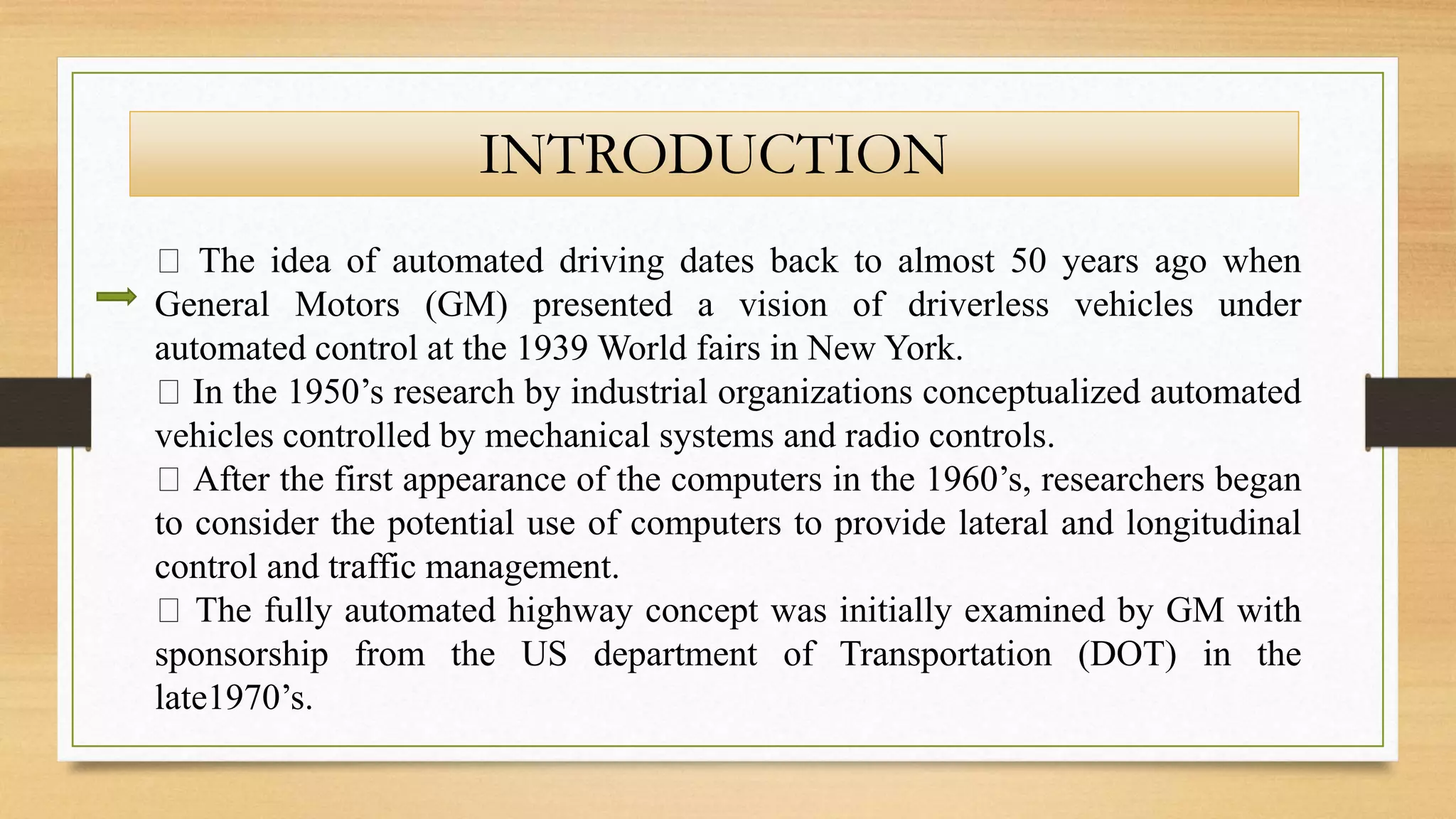 This document discusses the history and development of automated driving technologies from the 1930s to present day. It notes some of the early concepts from General Motors in the 1930s and research by industrial organizations in the 1950s exploring automated vehicle control through mechanical systems and radio controls. It then outlines increasing research interest from the 1960s onward as computer technologies advanced, allowing for lateral and longitudinal vehicle control as well as traffic management. This research continued through the 1980s and 1990s from organizations like GM, DOT and UC Berkeley PATH, although funding for fully automated highway programs was withdrawn in 1997. Research in this area continues today with a focus on nearer-term technologies.