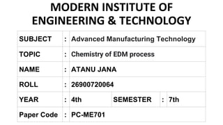 The document discusses Electrical Discharge Machining (EDM), including its history, basic concepts, types, applications, advantages, and disadvantages. EDM uses electrical sparks to erode metal materials and can machine hard metals and complex shapes that are difficult with traditional machining. While EDM allows machining of complex geometries with high precision and no cutting forces, it has disadvantages like slow material removal rates and the need to create specialized electrodes.