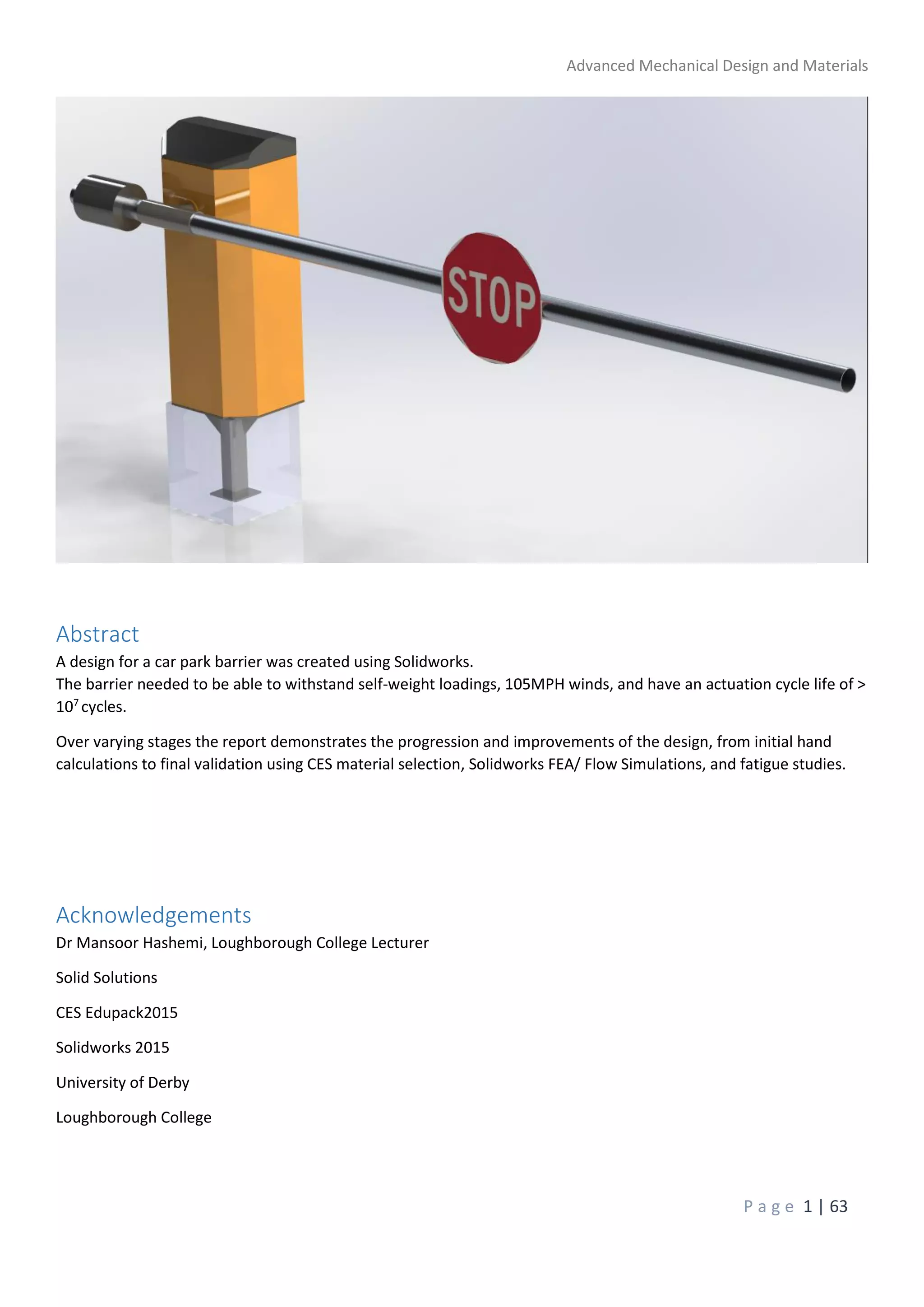 A design for a car park barrier was created using Solidworks to withstand wind speeds up to 105MPH and have an actuation cycle life of over 107 cycles. Initial hand calculations determined stresses from self-weight and wind loads. These identified maximum stresses of 80MPa for the boom arm and 398MPa for the motor shaft. An intentionally weak material was selected to initially fail the design. Subsequent FEA analysis and material selection iterations were performed to optimize the design, validating it could withstand the required loads with suitable safety factors.