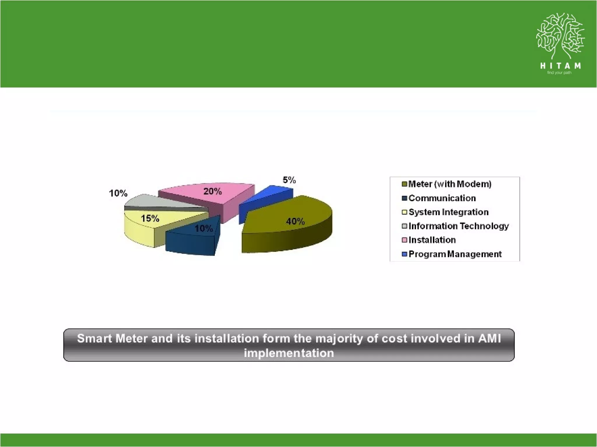 This document discusses advanced metering infrastructure (AMI). It defines AMI as a system that allows for two-way communication between utilities and smart meters, enabling near real-time collection and transfer of energy usage data. The key components of an AMI system include smart meters, communications infrastructure, home area networks, a meter data management system, and operational gateways. While costly to implement, AMI provides benefits like improved reliability, lower energy costs, and reduced electricity theft. The document also examines AMI in the context of India's power grid and estimates costs associated with deployment.