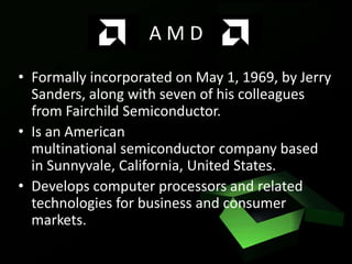 AMD was founded in 1969 by seven colleagues from Fairchild Semiconductor. It is based in California and specializes in microprocessors and graphics technologies for business and consumer markets. In the 1970s and 1980s, AMD produced second-source Intel x86 chips but later introduced its own 386-compatible processor. Today, AMD produces CPUs, GPUs, and APUs using architectures like Bulldozer and Jaguar. Notable products include the Radeon graphics brand and FX series CPUs.