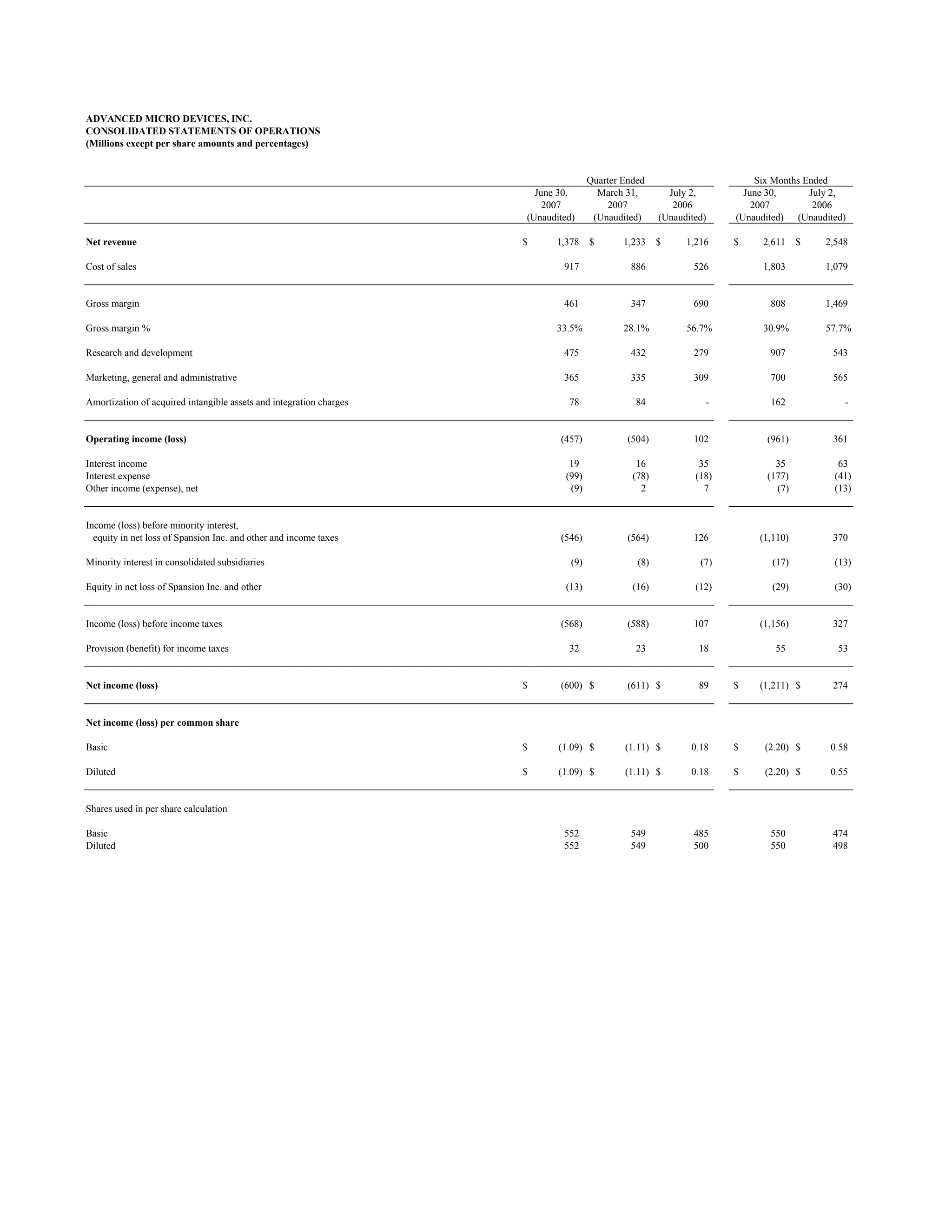 - Advanced Micro Devices reported a net loss of $600 million for the quarter ended June 30, 2007, bringing the total net loss for the first half of 2007 to $1.211 billion. - Revenue increased 11.9% compared to the previous quarter but the gross margin percentage declined from 28.1% to 33.5% due to higher costs. - Research and development expenses increased 9.5% compared to the previous quarter as the company continued investing in new products.