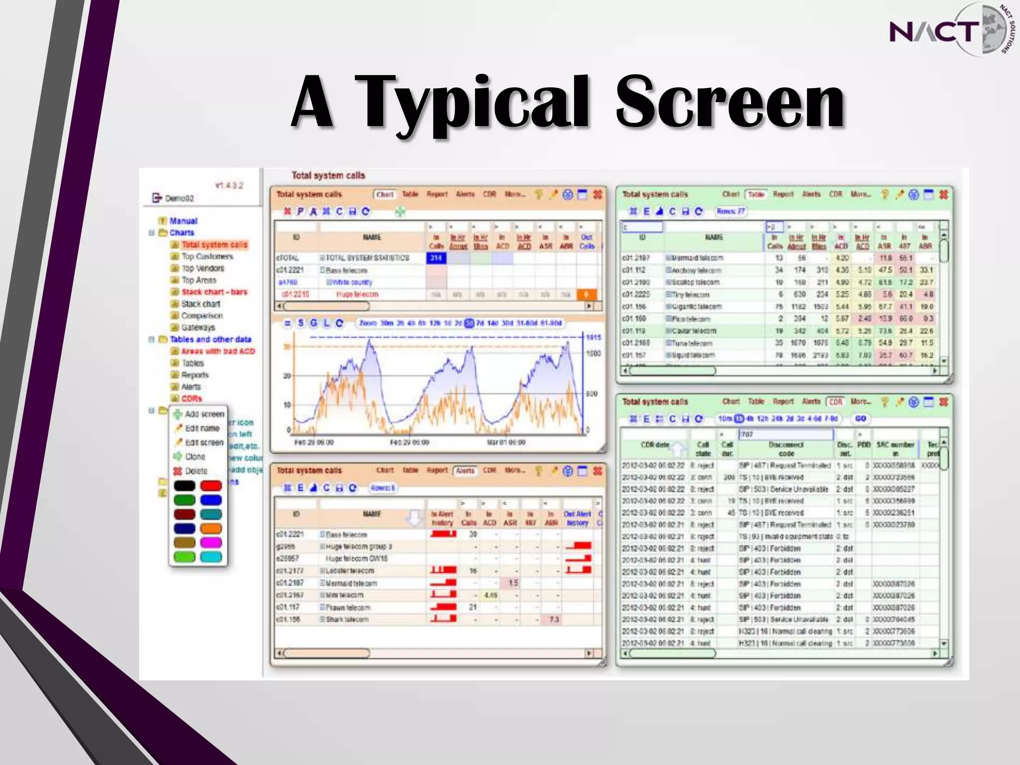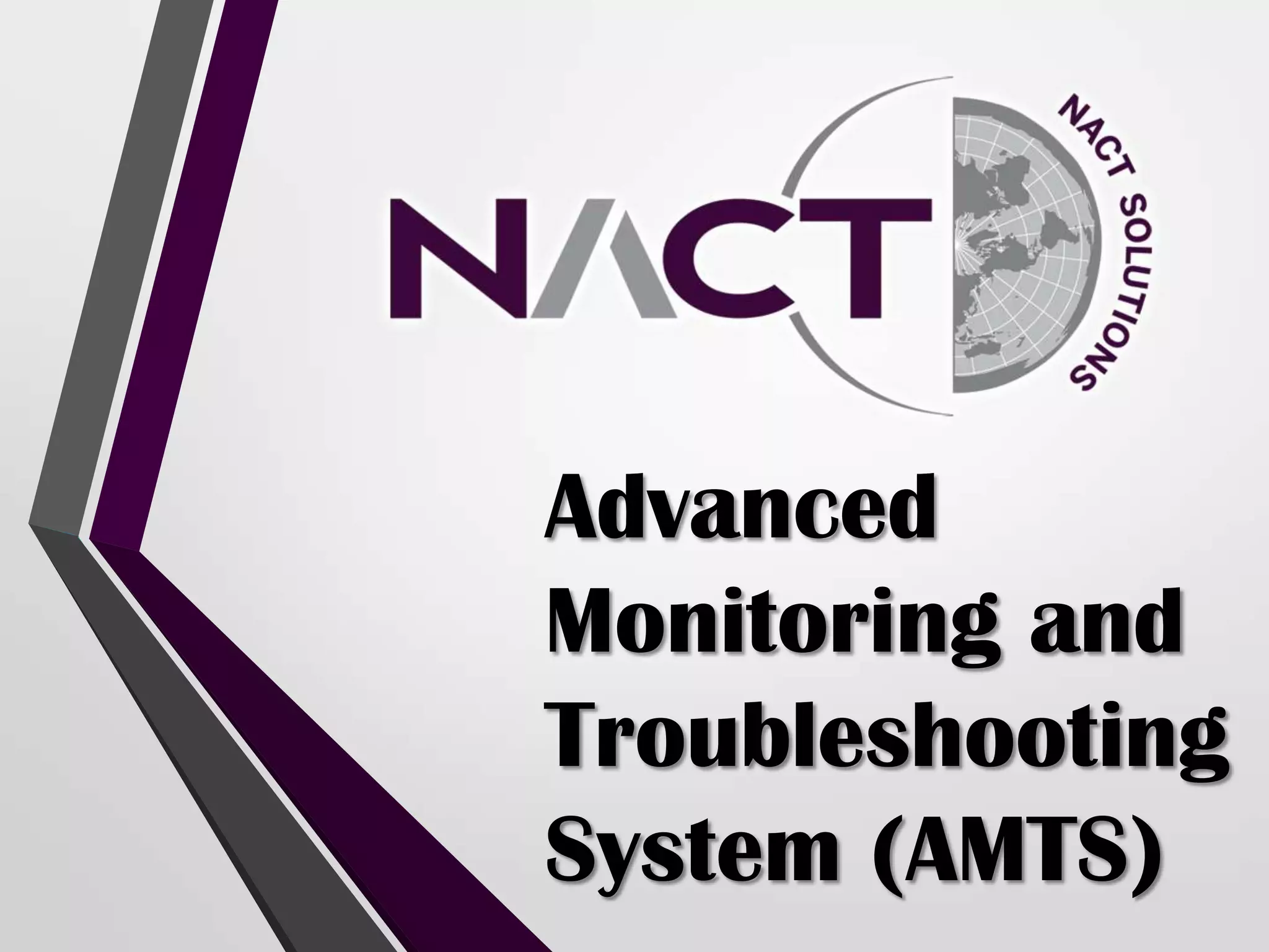 The Advanced Monitoring and Troubleshooting System (AMTS) is a comprehensive traffic analysis system that monitors switches and calculates key performance metrics. It features charts, tables, reports, alerts, call detail record viewing, and flexible user management. The AMTS monitors objects like customers, vendors, and equipment, as well as relationships between them. It calculates numerous metrics including current calls, call attempts, connected calls, switched minutes, and financial calculations. It provides alerts, reports, customizable screens and menus, and the ability to monitor via Simple Network Management Protocol.