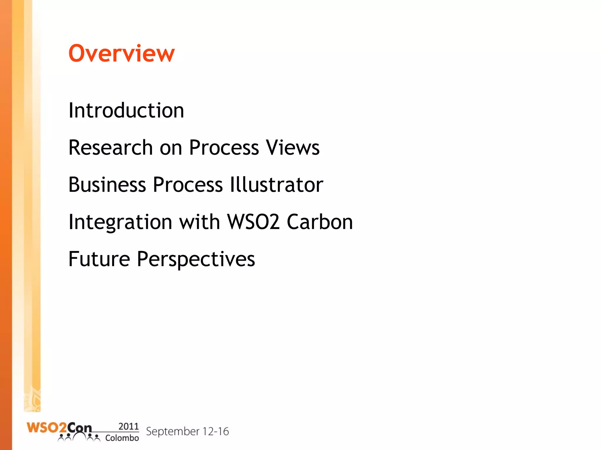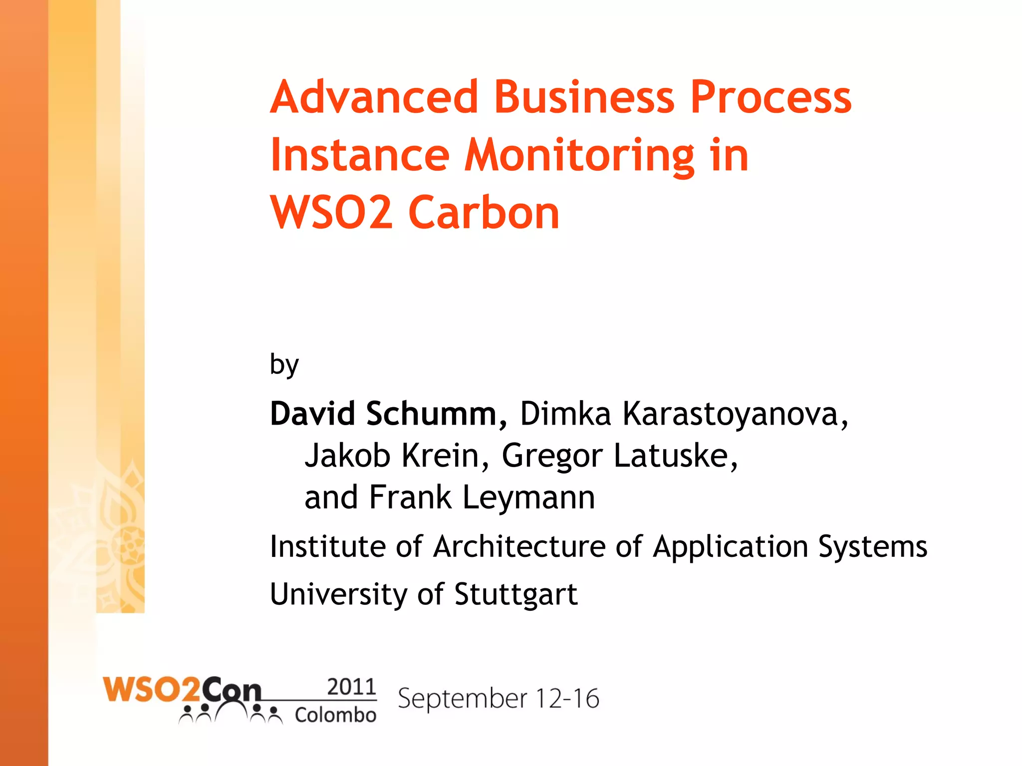 This document summarizes a research project on advanced business process monitoring using process views. The project integrated a process monitoring tool called Business Process Illustrator (BPI) with the WSO2 Carbon middleware platform. BPI provides graphical process instance monitoring at different abstraction levels and links process performance data. The integration with WSO2 Carbon allows for seamless monitoring of processes deployed on the WSO2 Business Process Server. Future work will focus on state projections across process models and languages and on configurable graphical views.