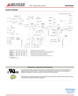 This servo drive amplifier can provide up to 250A of peak current and 150A of continuous current. It is designed to drive brushless DC motors and interface with digital controllers. It has protection against overheating, overcurrent and other faults. Operating modes include current control, velocity control using encoders or Hall sensors, and it can drive brushed or brushless motors.