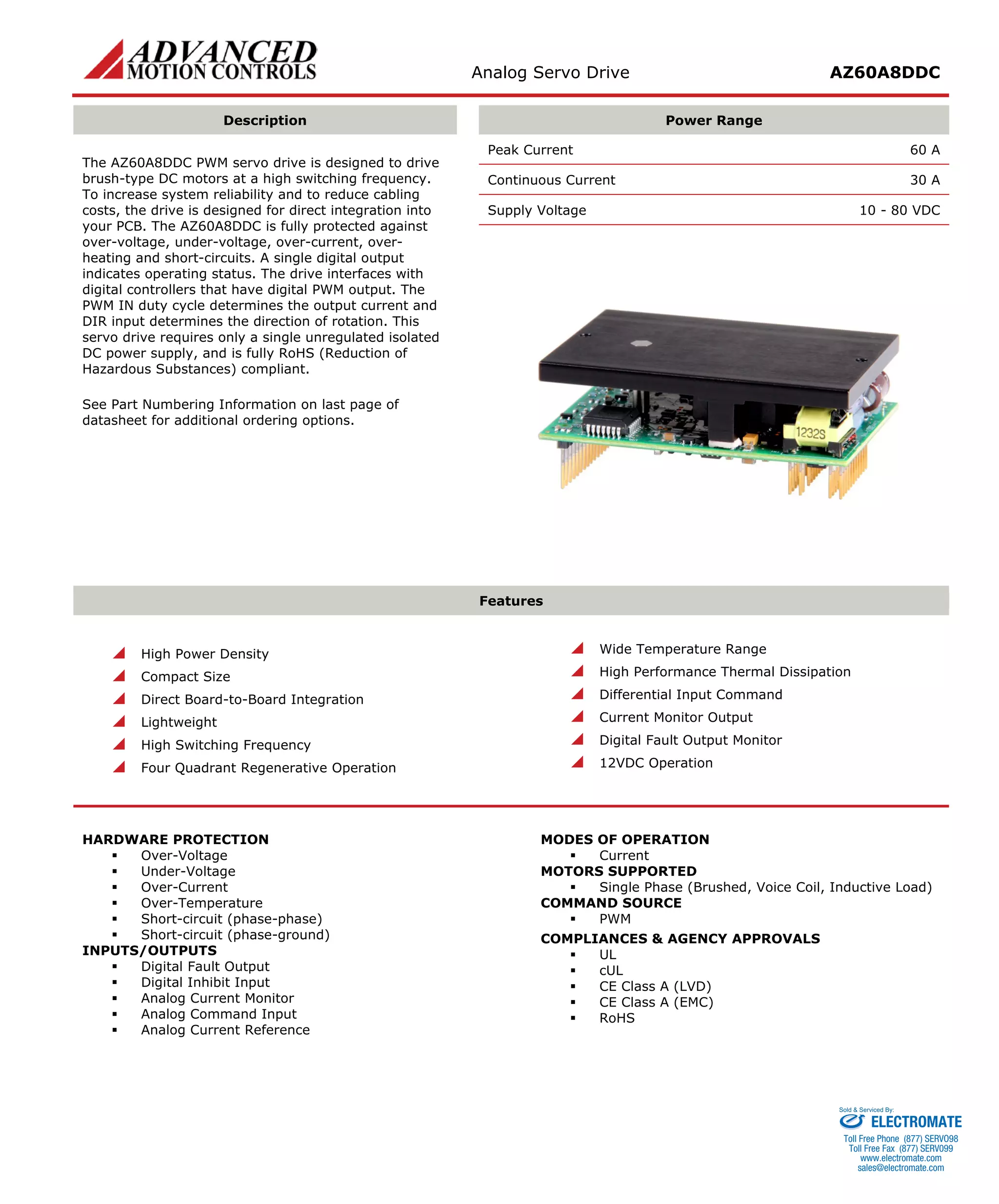 The AZ60A8DDC is a PWM servo drive designed to drive brush-type DC motors at high switching frequencies. It has a peak current of 60A, continuous current of 30A, and operates from 10-80VDC. The drive provides motor control and protection from overvoltage, undervoltage, overcurrent and more.