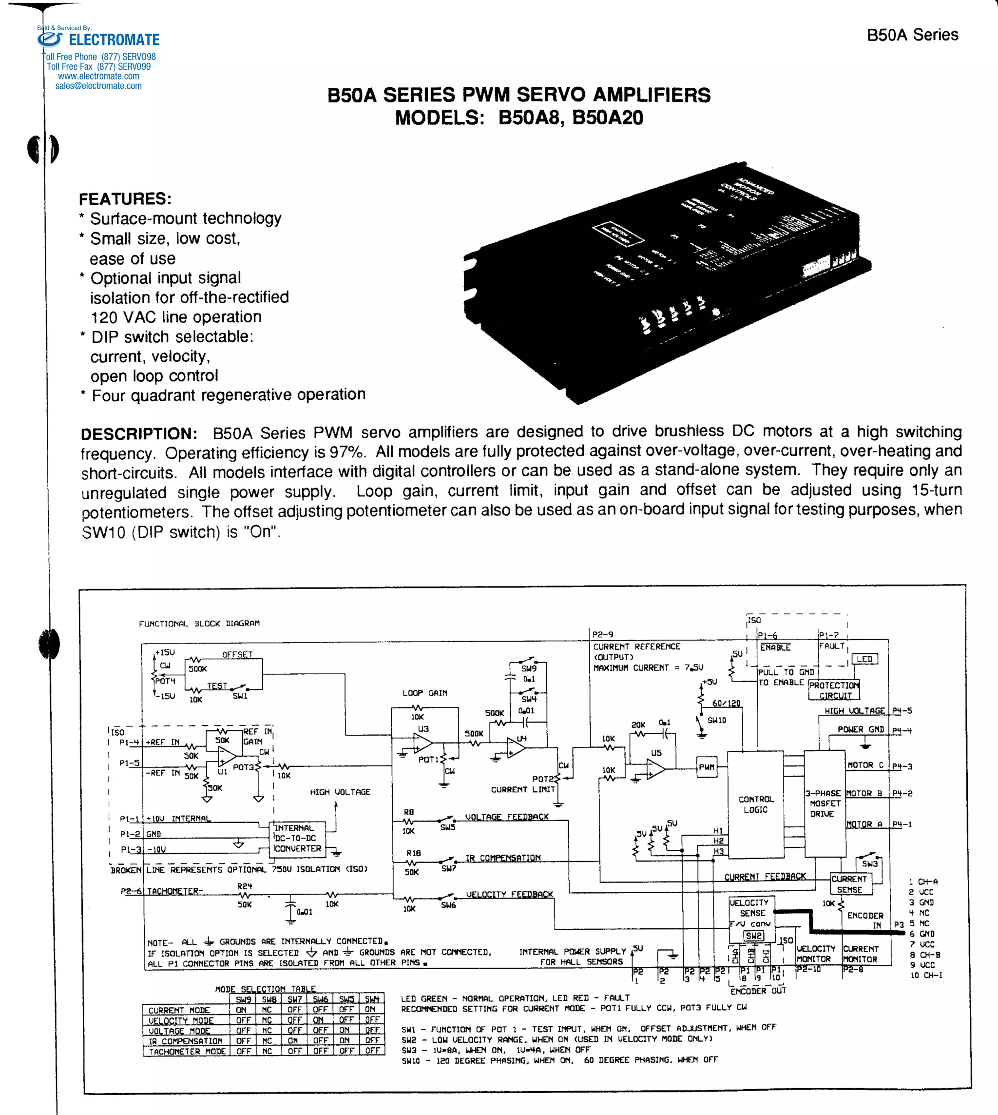The document describes B50A series power amplifiers for driving brushless DC motors. It provides specifications for two models, the B50A8 and B50A20, including voltage and current ratings, switching frequency, inputs/outputs, and mechanical details. The amplifiers feature surface mount technology, small size, low cost, and optional signal isolation. They are fully protected against over-voltage, over-current, and short circuits.