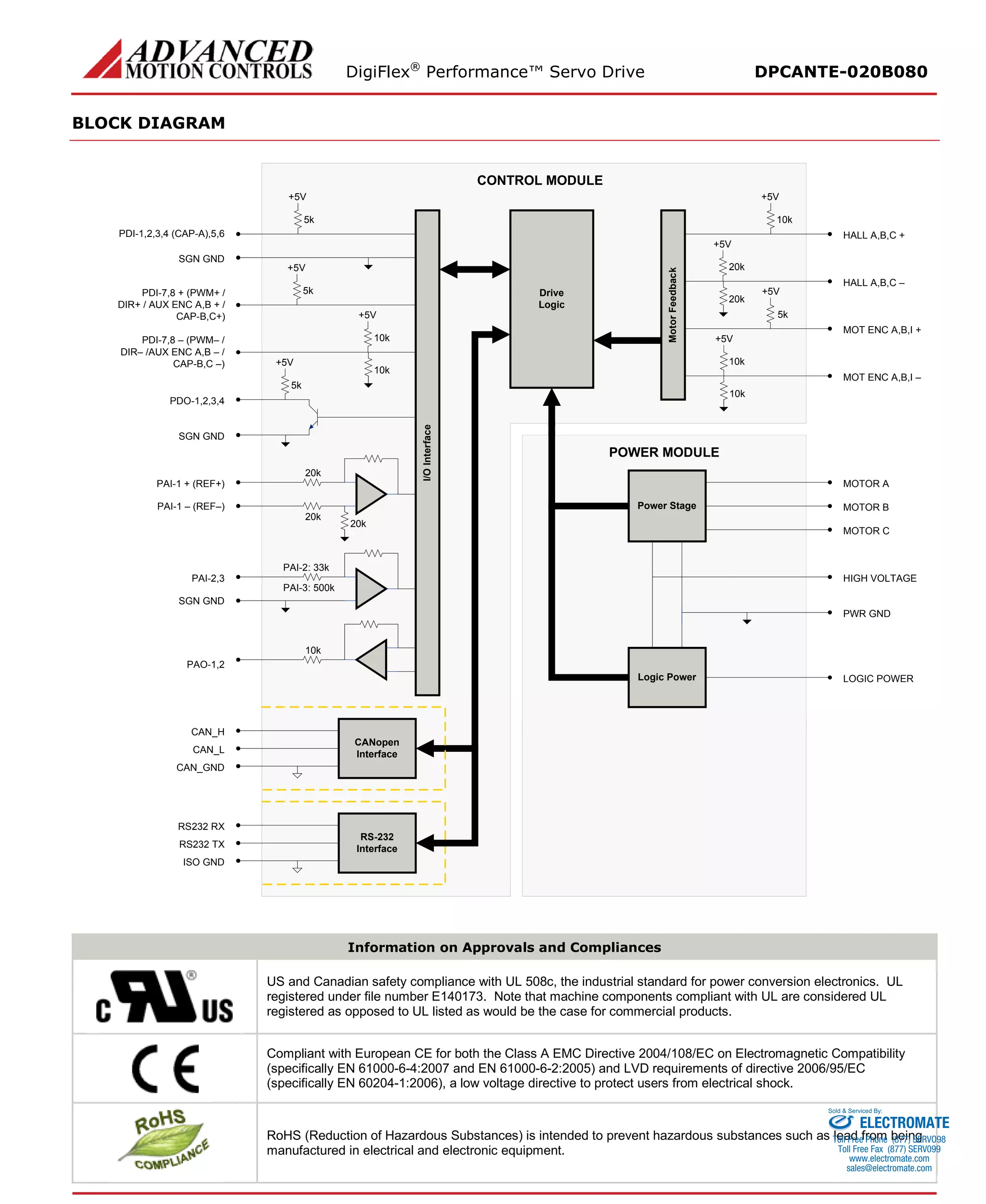 The DigiFlex® PerformanceTM Servo Drive is a fully digital servo drive designed to drive brushed and brushless motors in torque, velocity, or position mode. It uses Space Vector Modulation for high efficiency and features CANopen and RS-232 interfaces, programmable I/O, and integrated safety certifications. The drive provides 20A peak current, operates from 20-80VDC, and measures 132.5 x 89.5 x 35.9 mm.