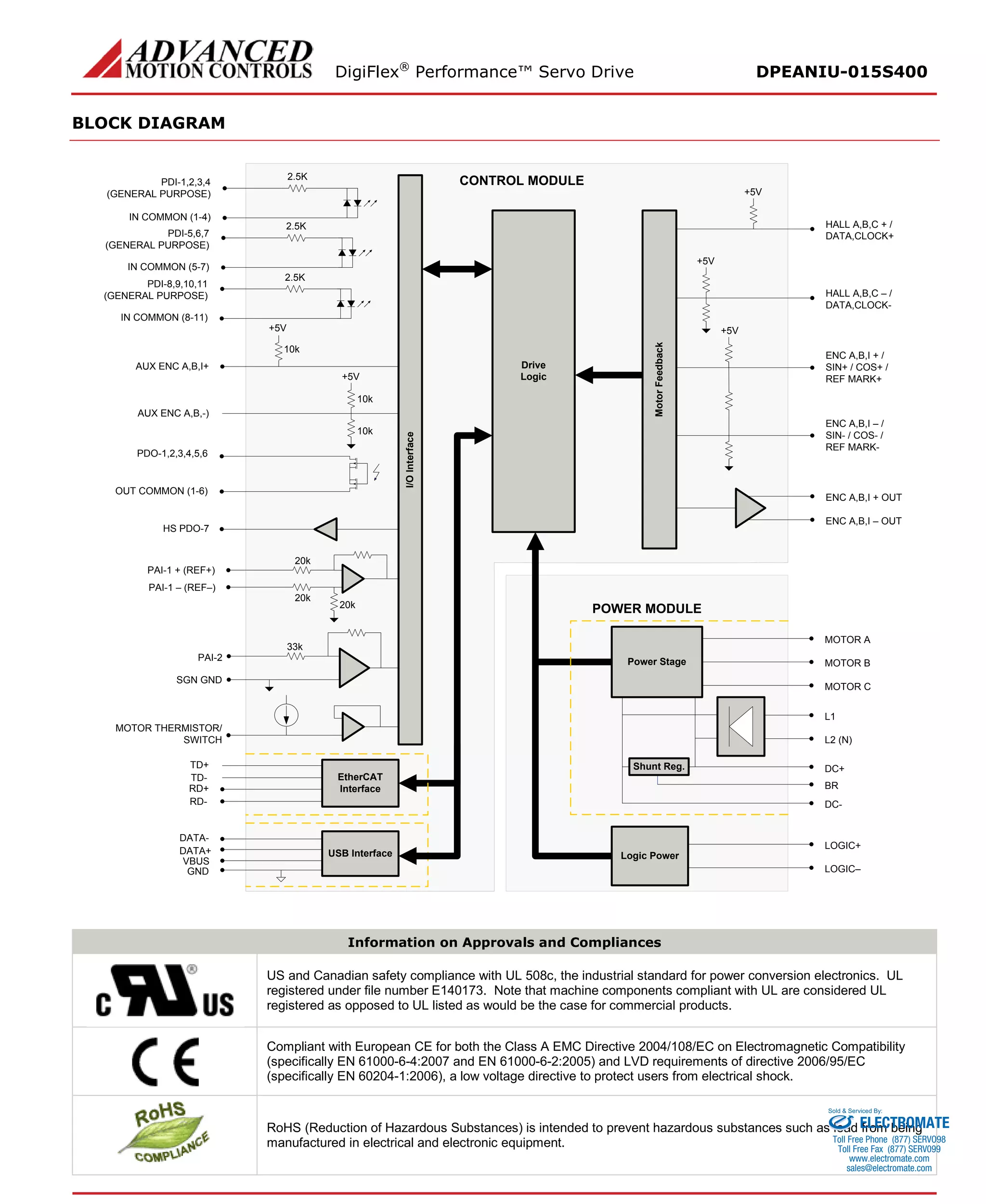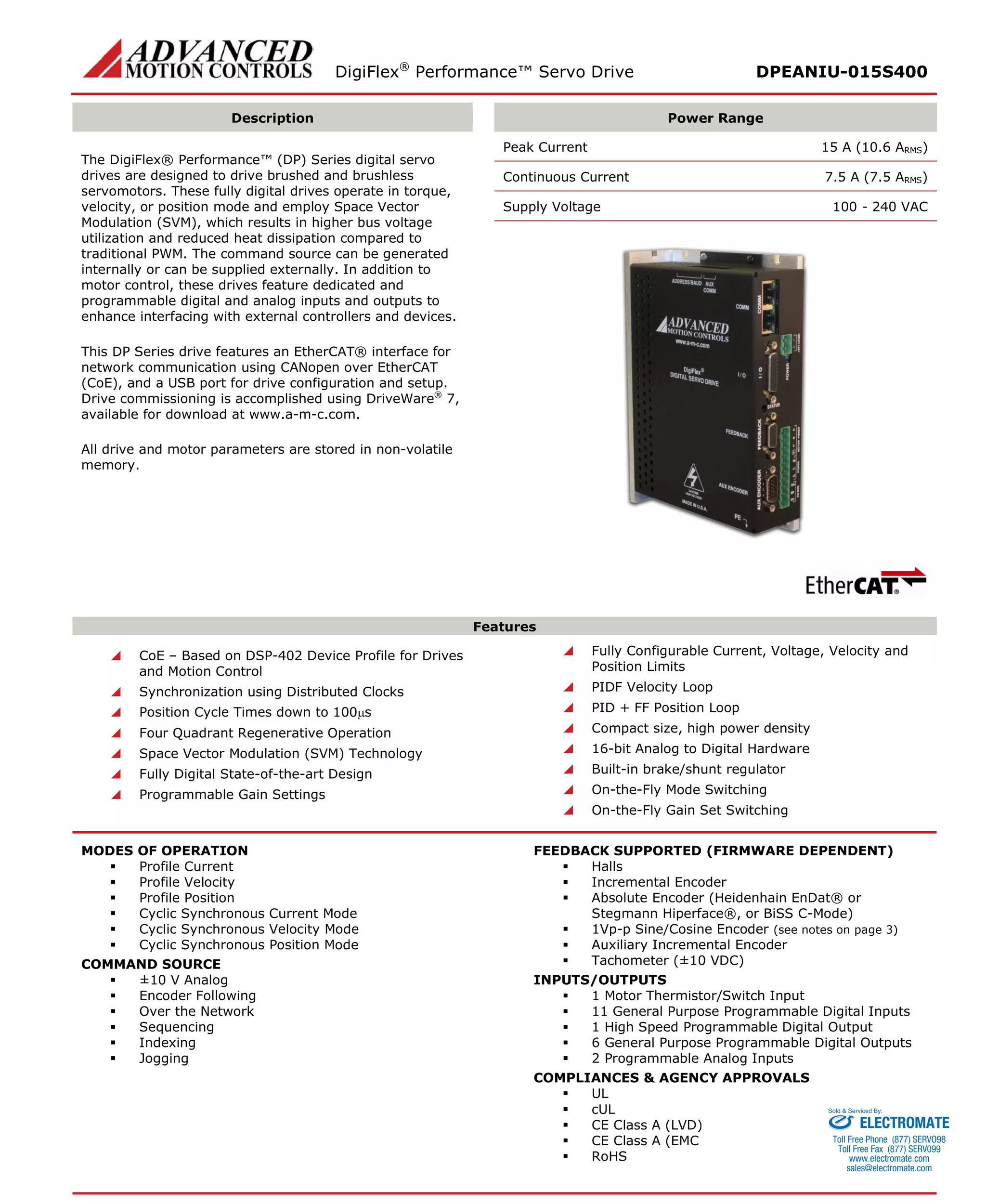 This servo drive is designed to drive brushed and brushless motors in torque, velocity, or position mode. It features an EtherCAT interface for network communication and USB port for configuration. It supports various feedback types including encoders and has programmable digital and analog inputs and outputs. The drive operates in different motor control modes and can be commanded from various sources over networks or analog signals.