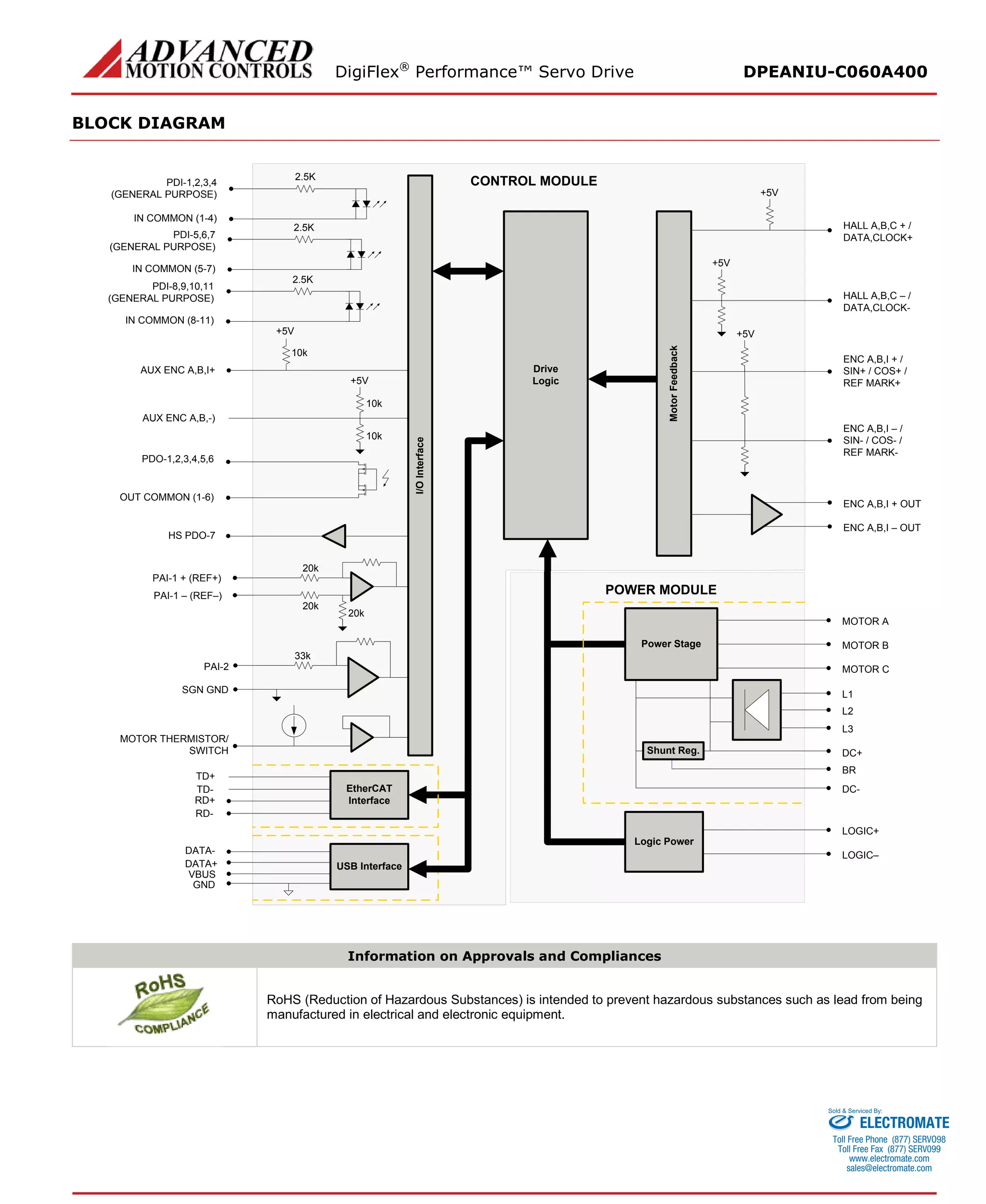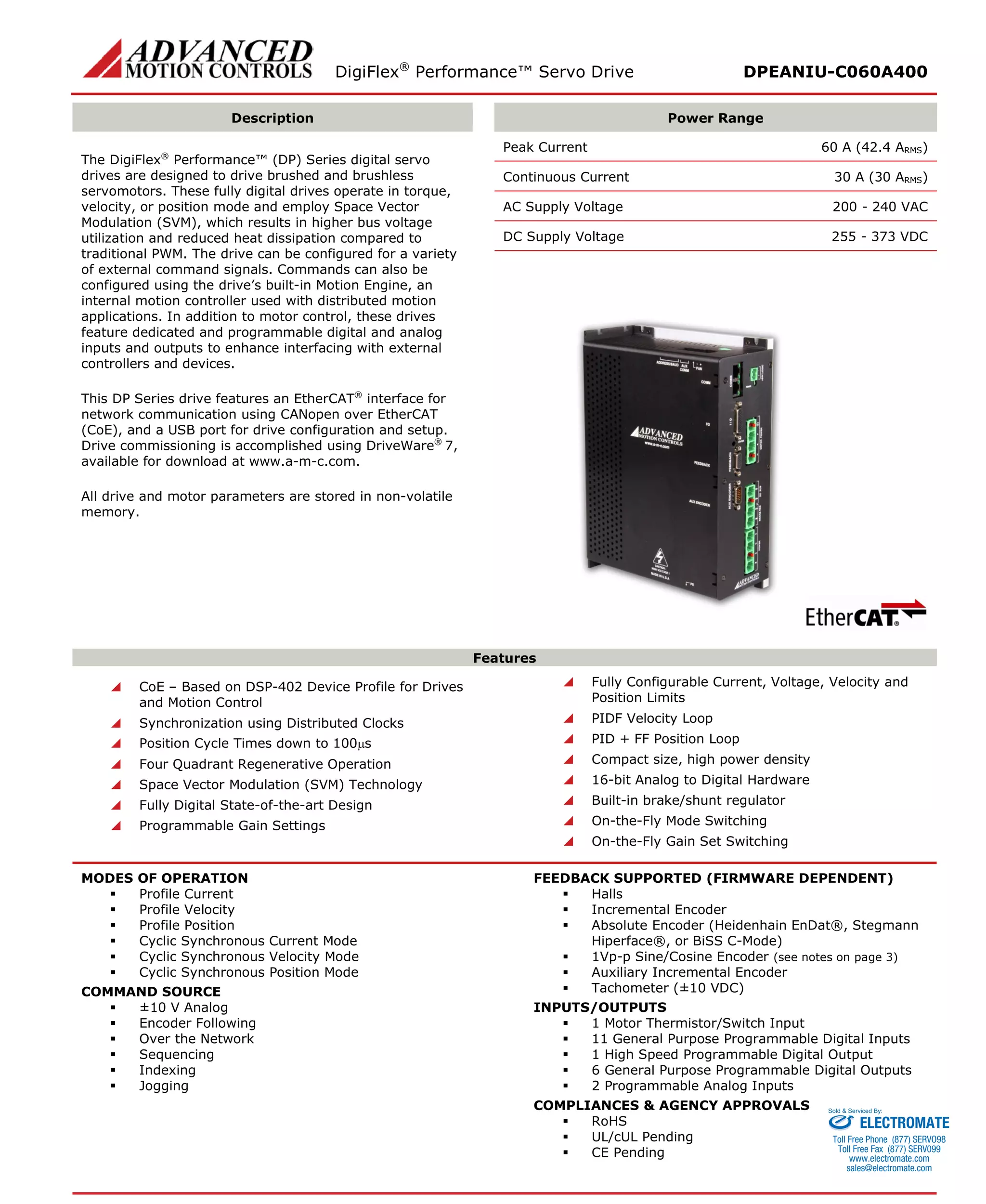 This document provides information on the DigiFlex® PerformanceTM Servo Drive DPEANIU-C060A400. It is a digital servo drive designed to drive brushed and brushless servomotors in torque, velocity, or position mode. It features an EtherCAT interface and supports various motor feedback types. The drive provides programmable digital and analog inputs and outputs to interface with external devices. It has a peak current rating of 60A and is compliant with RoHS and pending UL/cUL and CE approvals.