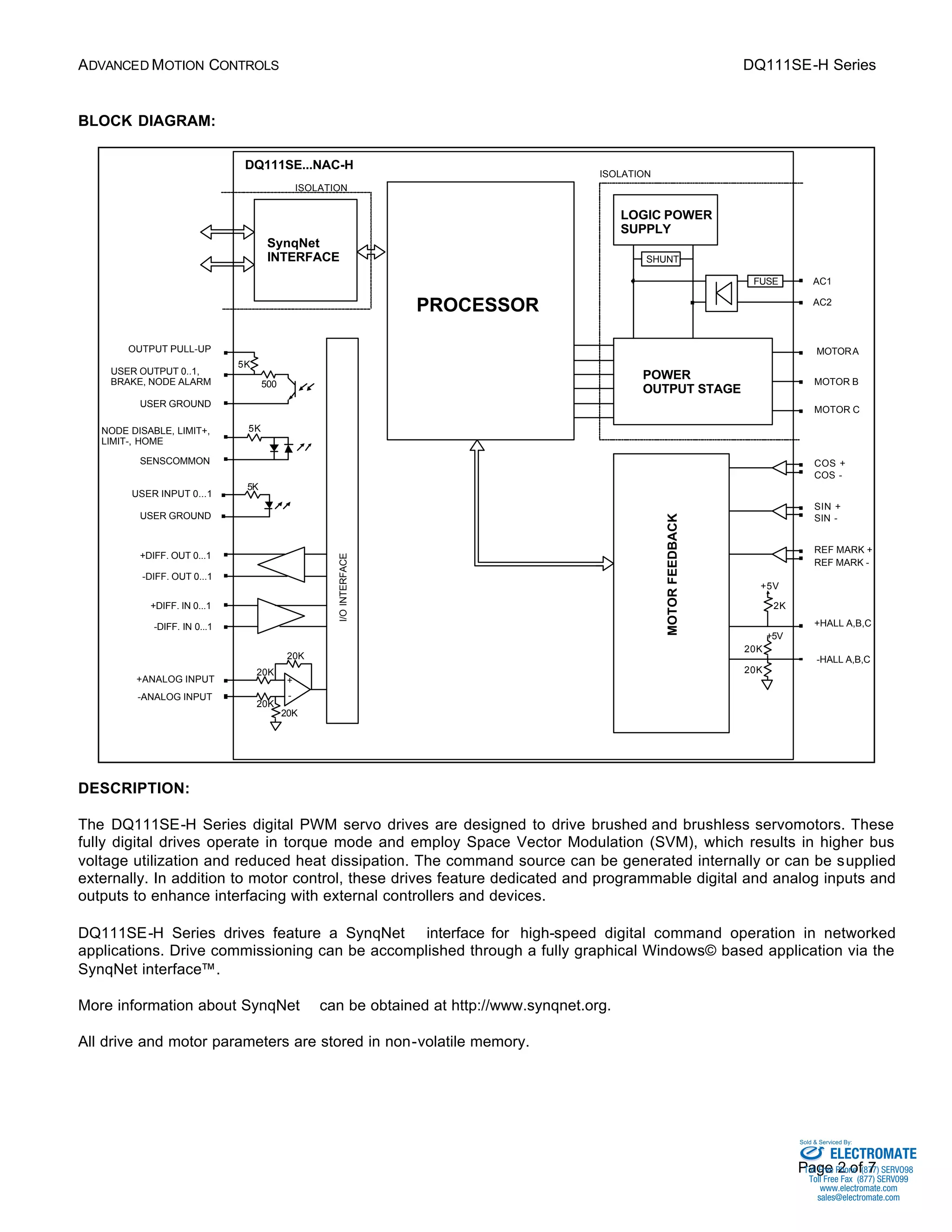 The DQ111SE-H Series is a fully digital servo drive for brushed and brushless motors. It features space vector modulation, a 20kHz digital current loop, sine/cosine encoder interface, hall sensor or encoder commutation, and SynqNet network interface. The drive provides motor control along with dedicated digital and analog inputs and outputs.