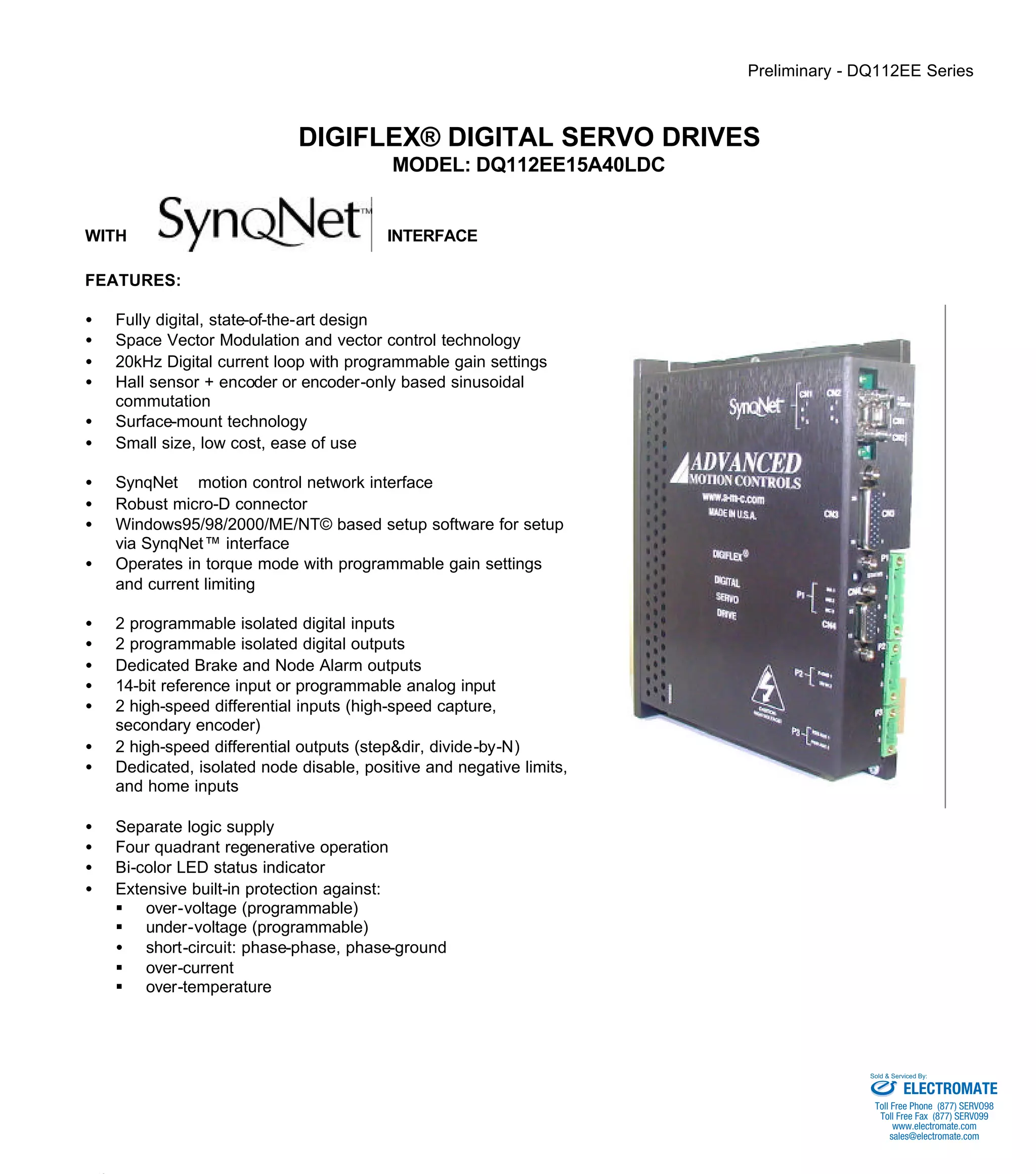 The DQ112EE15A40LDC is a digital servo drive with features such as space vector modulation, hall sensor and encoder feedback, isolated I/O, and a SynqNet interface. It provides motor control and I/O expansion for networked motion control applications. Key specifications include a 60-400VDC input, 15A peak current, and 20kHz switching frequency.