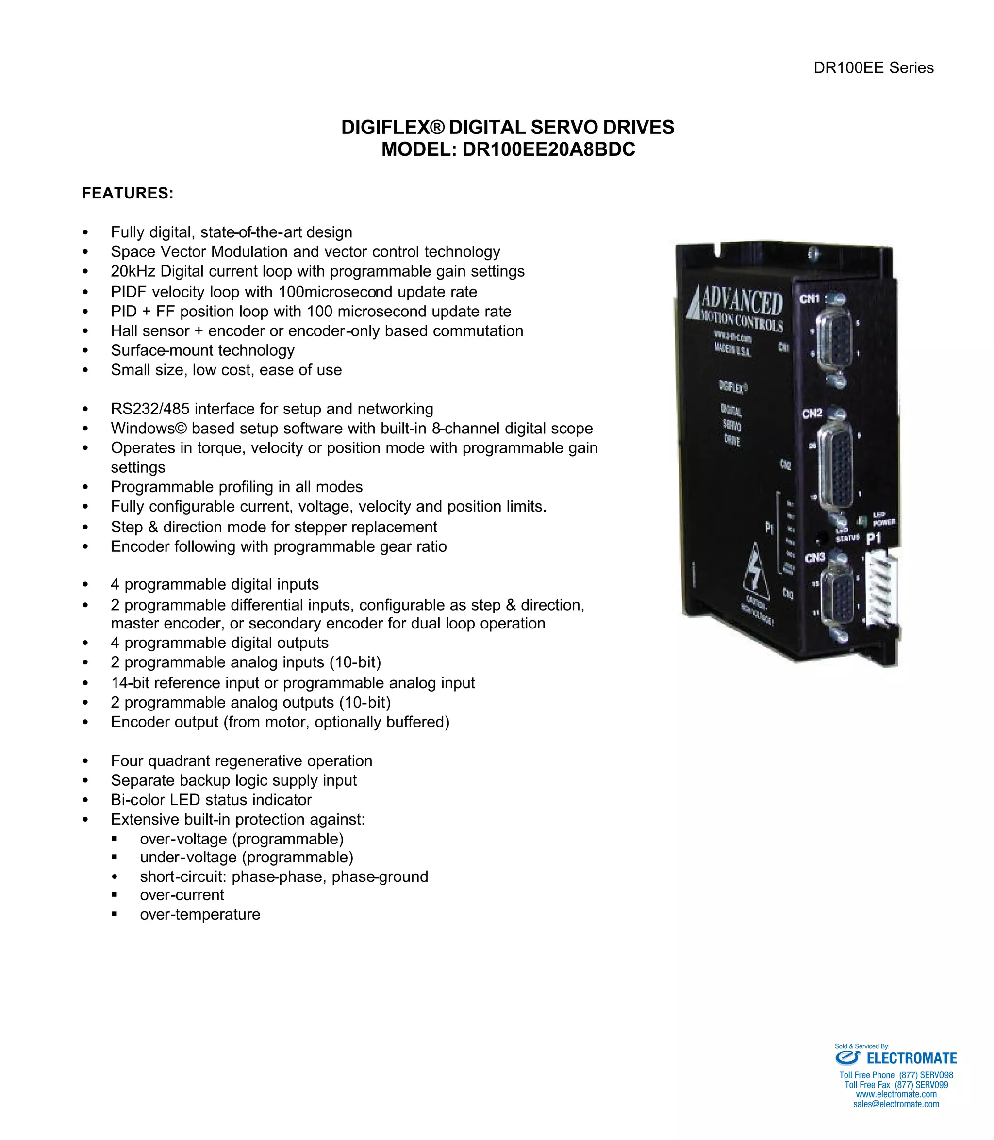 The DR100EE Series digital servo drives are fully digital PWM drives designed to control brushed and brushless servomotors. They operate in torque, velocity, or position mode using space vector modulation for high bus voltage utilization. The drives feature configurable digital and analog inputs and outputs for interfacing, and are set up using Windows-based software over an RS232/485 interface.