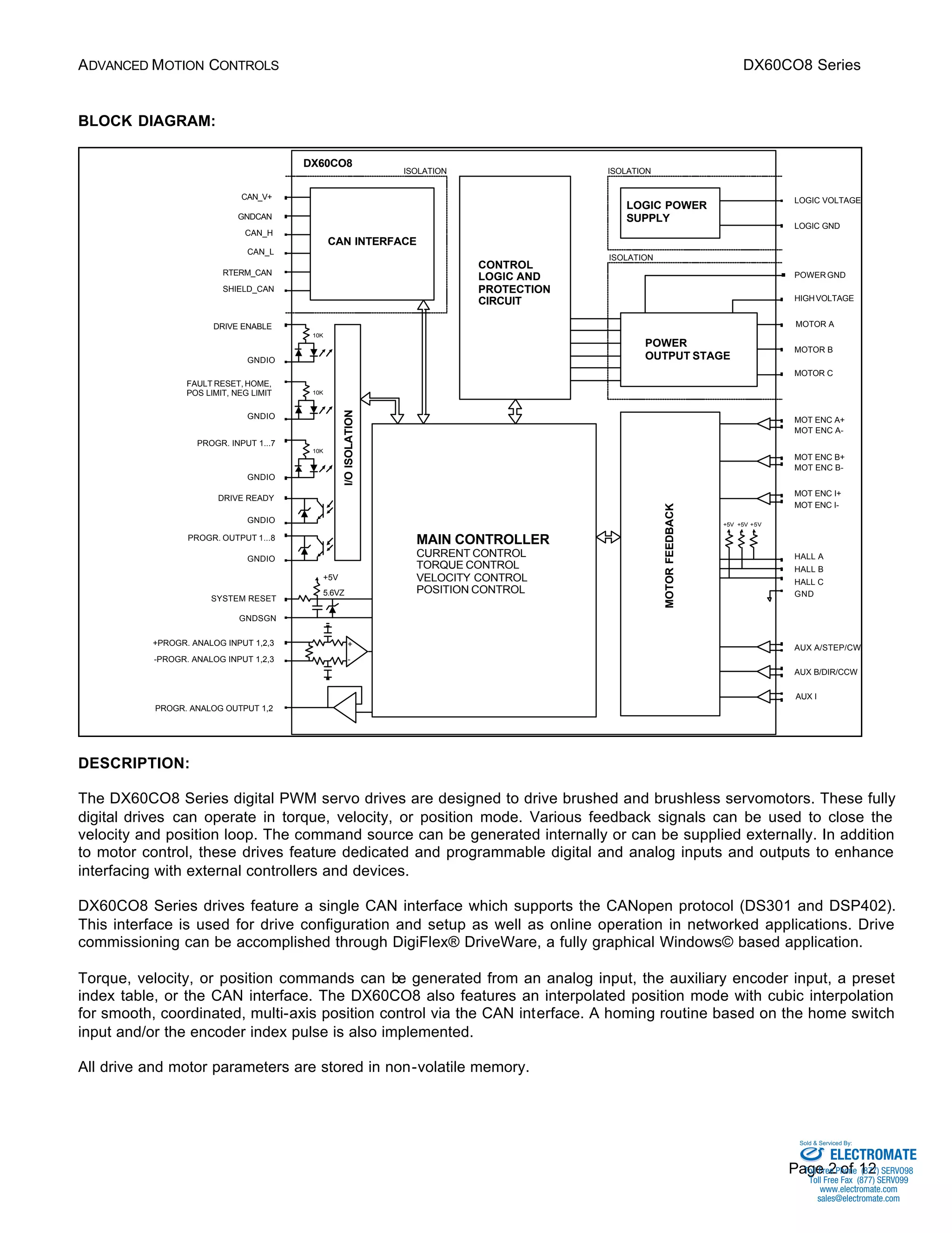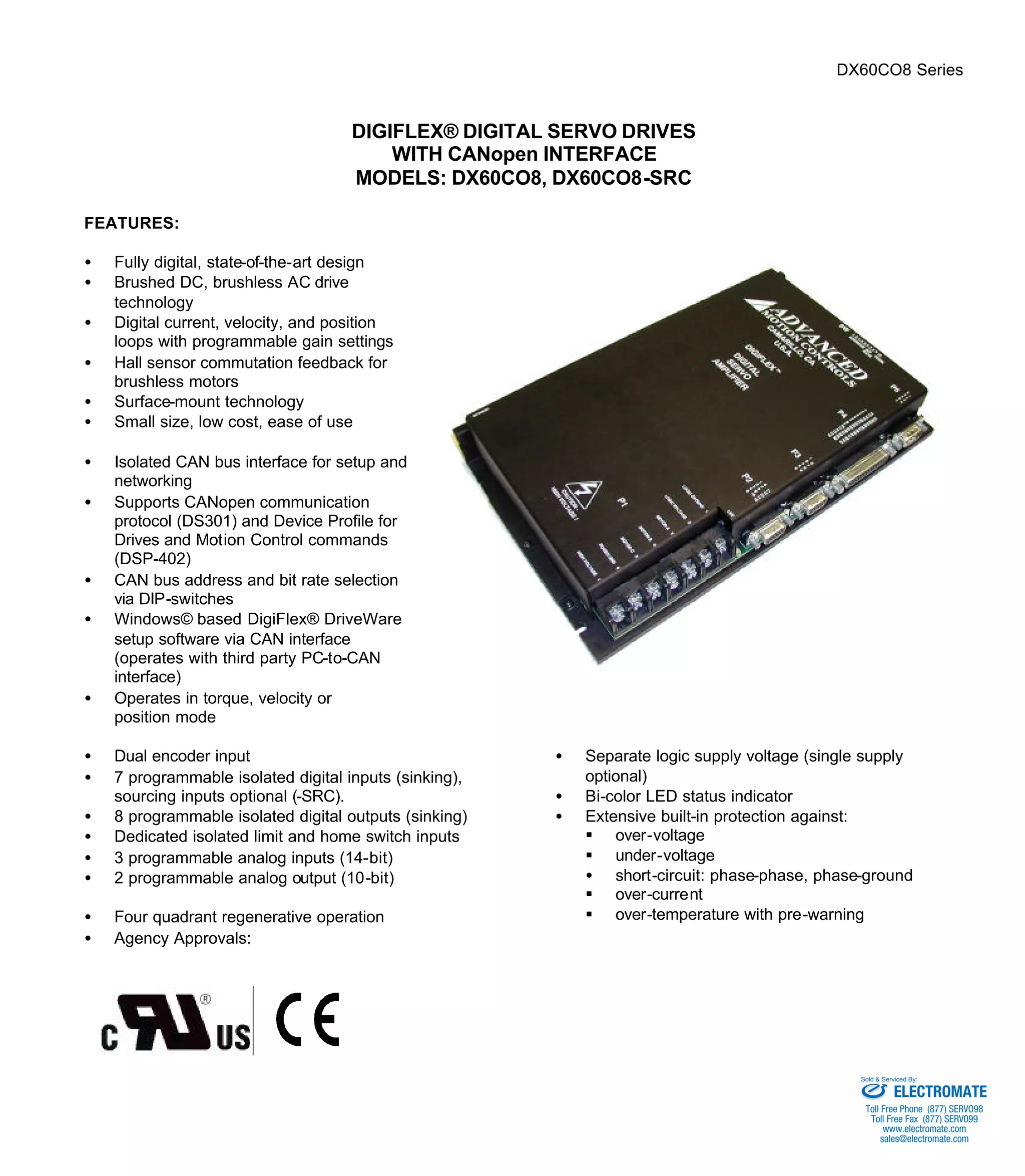 The DX60CO8 digital servo drive is designed to drive brushed and brushless motors. It features fully digital control loops, CANopen communication, and programmable I/O. Setup and configuration is done through DigiFlex DriveWare software via the isolated CAN interface, which supports DS301 and DSP402. The drive provides torque, velocity, or position control and integrated protection features.