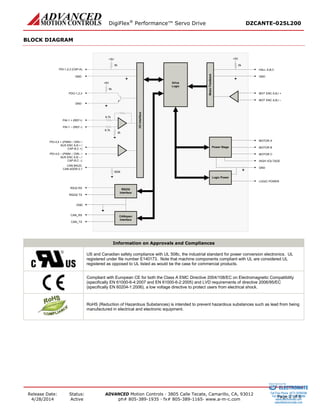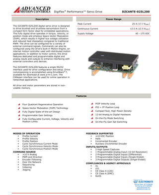 The DigiFlex® PerformanceTM Servo Drive DZCANTE-025L200 is a fully digital servo drive designed to control brushed and brushless servomotors. It operates in torque, velocity, or position mode using space vector modulation for higher efficiency. The drive features programmable digital and analog inputs and outputs, and supports various feedback and command sources. It communicates using CANopen and has a peak current of 25A and continuous current of 12.5A, with agency approvals including CE, cUL, and RoHS compliance.