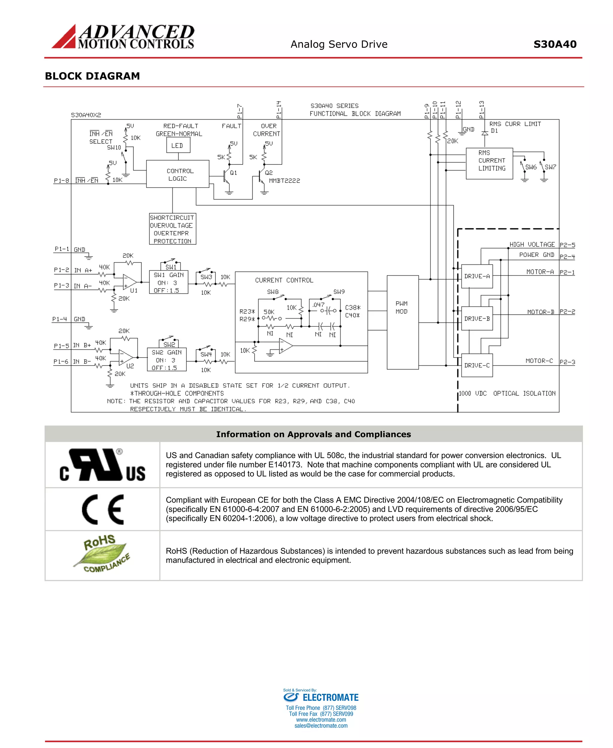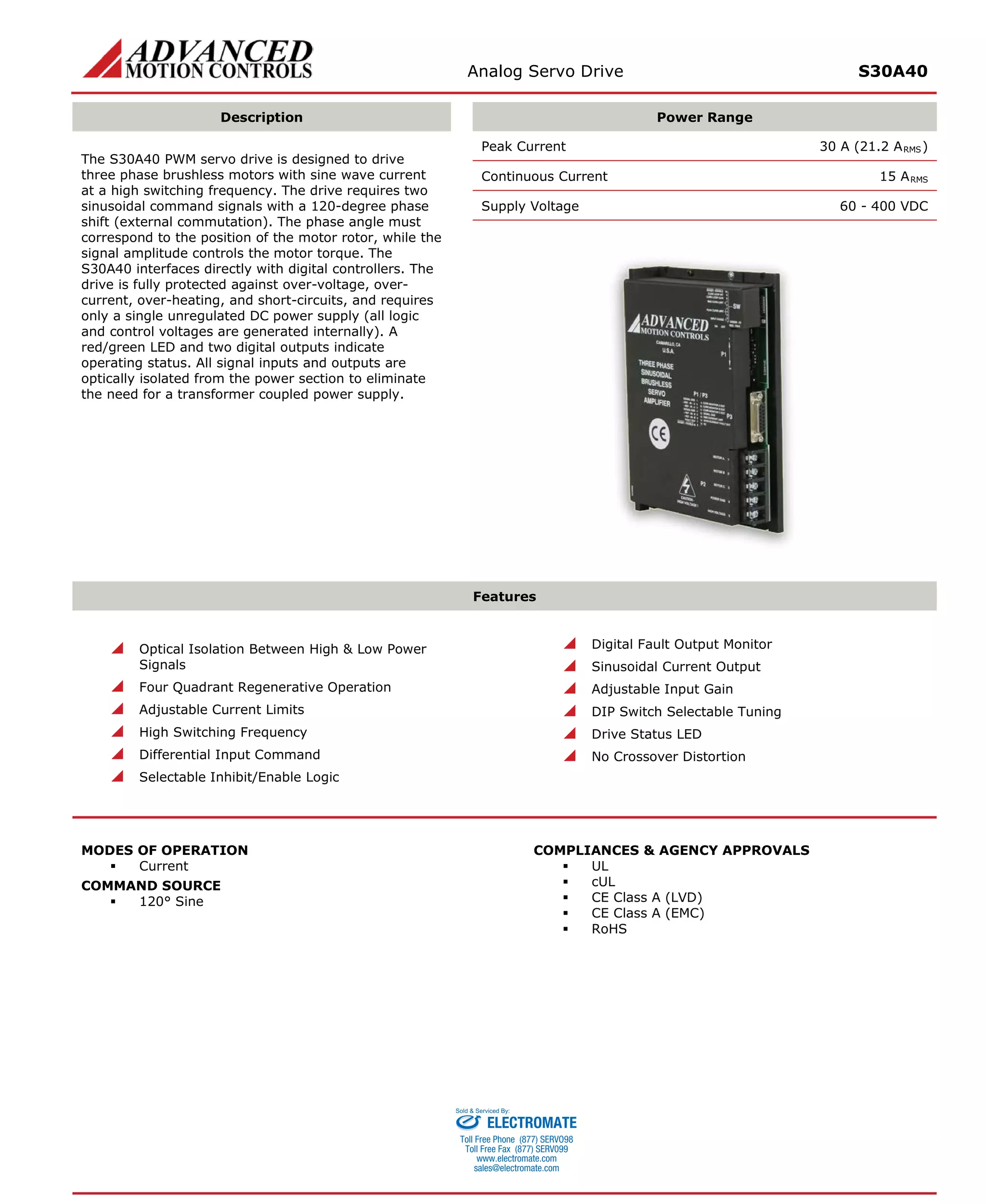The S30A40 analog servo drive is designed to drive 3-phase brushless motors with sine wave current. It interfaces with digital controllers and requires 2 sinusoidal command signals with 120° phase shift for motor commutation. The drive provides protection against overvoltage, overcurrent and other faults. It operates from a single DC power supply and has optical isolation between high and low power signals.