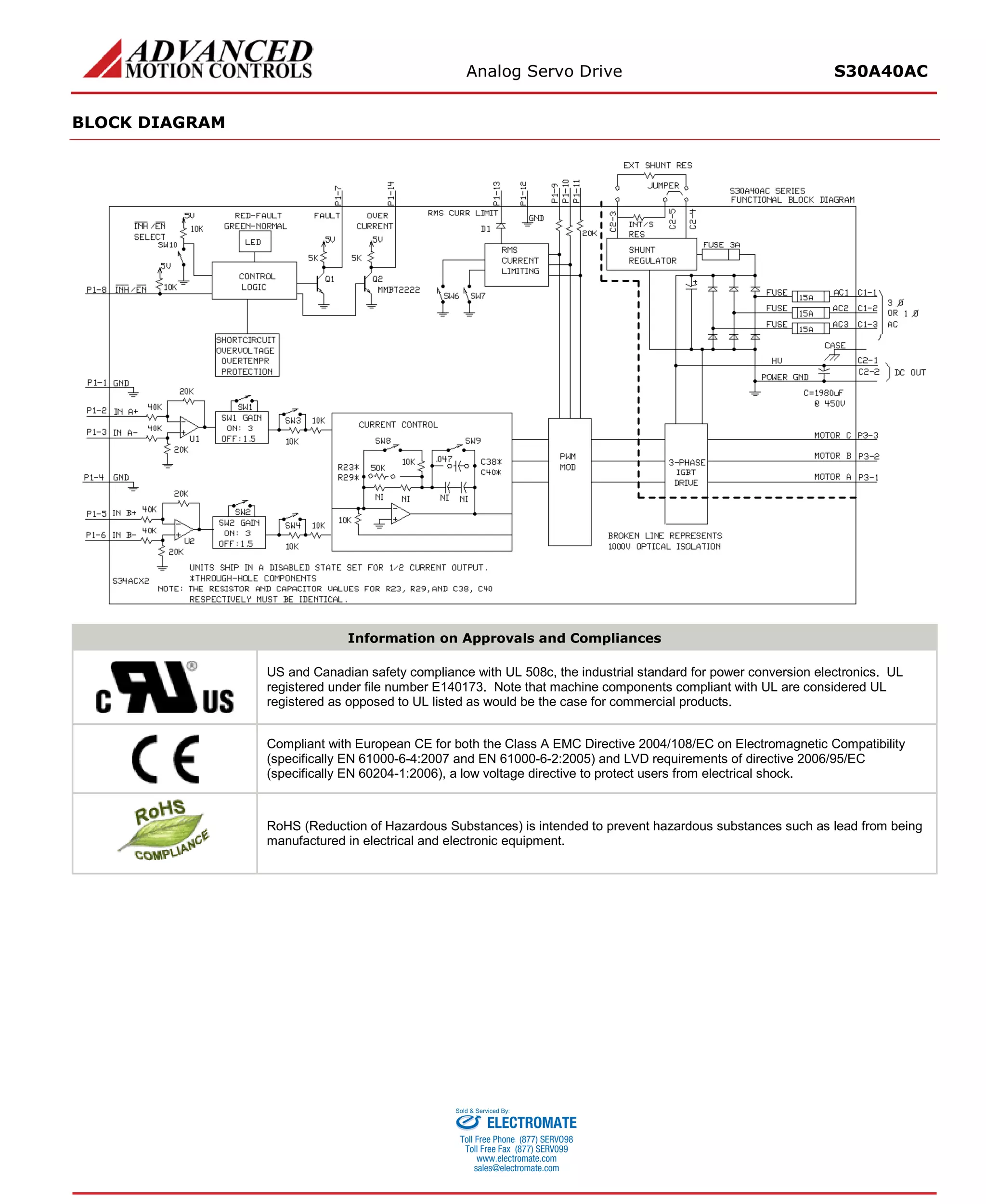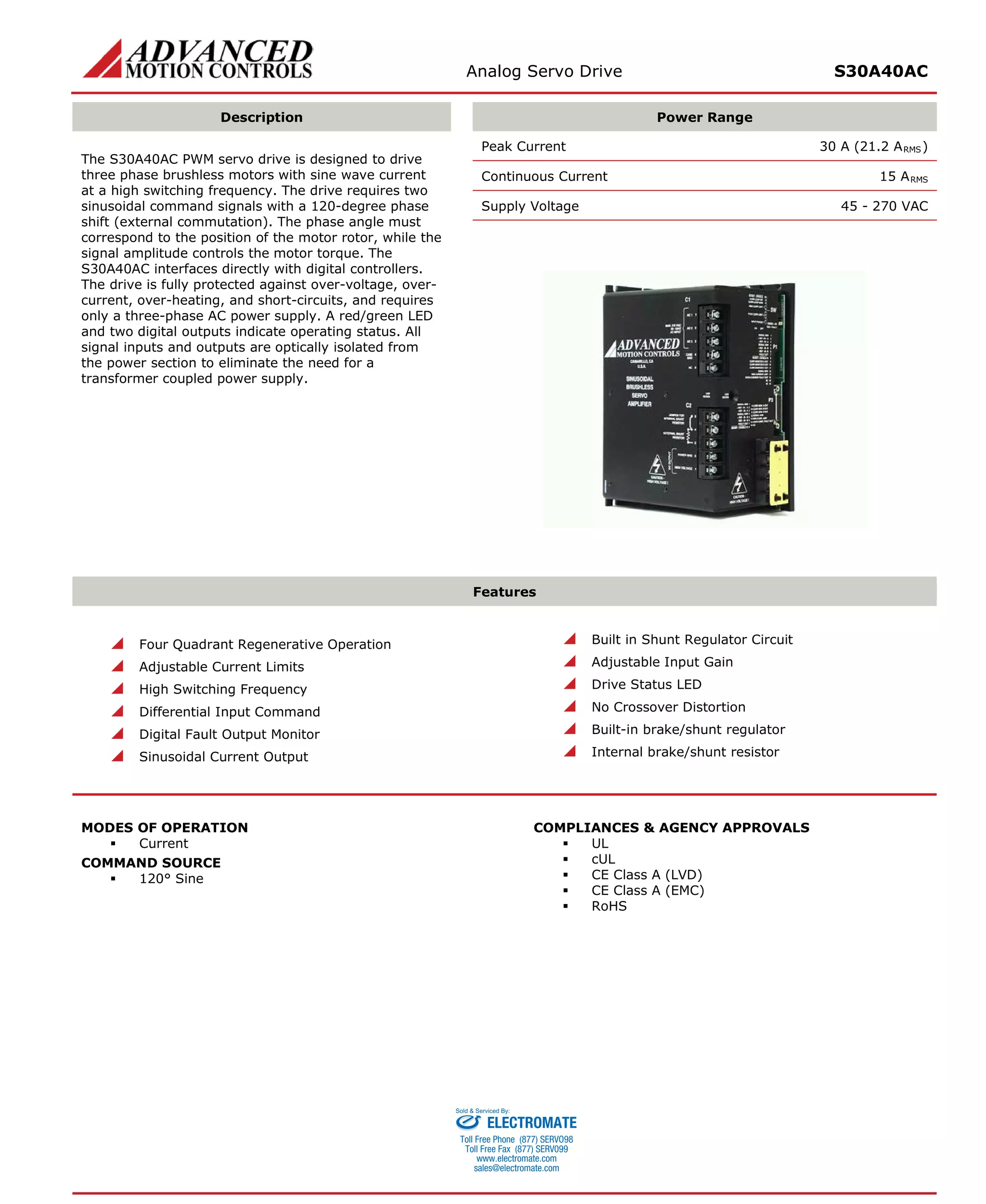 The document provides specifications for the S30A40AC analog servo drive. It is designed to drive 3-phase brushless motors with sine wave current at high frequencies. It requires two 120-degree phase shifted sine wave command signals for commutation and torque control. The drive has overcurrent, overvoltage, and thermal protections. It is compliant with various safety and EMC standards.