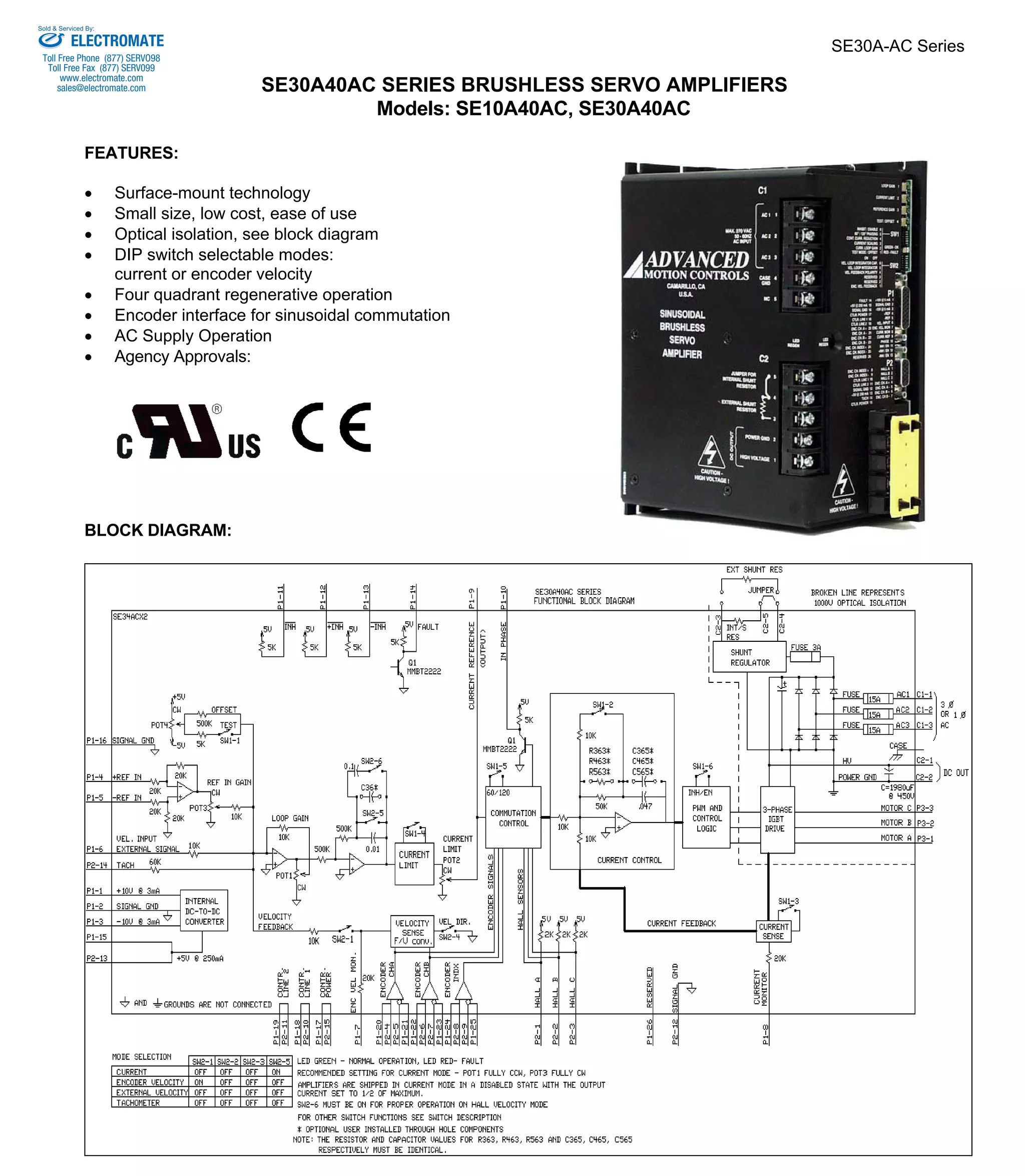 This document describes the SE30A-AC series of brushless servo amplifiers manufactured by Electromate. Key features include small size, surface mount technology, optical isolation, DIP switch selectable operating modes, regenerative braking, and agency approvals. The amplifiers generate 3-phase sine waves from an encoder to drive brushless motors and require either single or 3-phase AC power. Specifications include continuous and peak current limits, switching frequency, and mechanical dimensions. Connector pinouts and functions are also provided.
