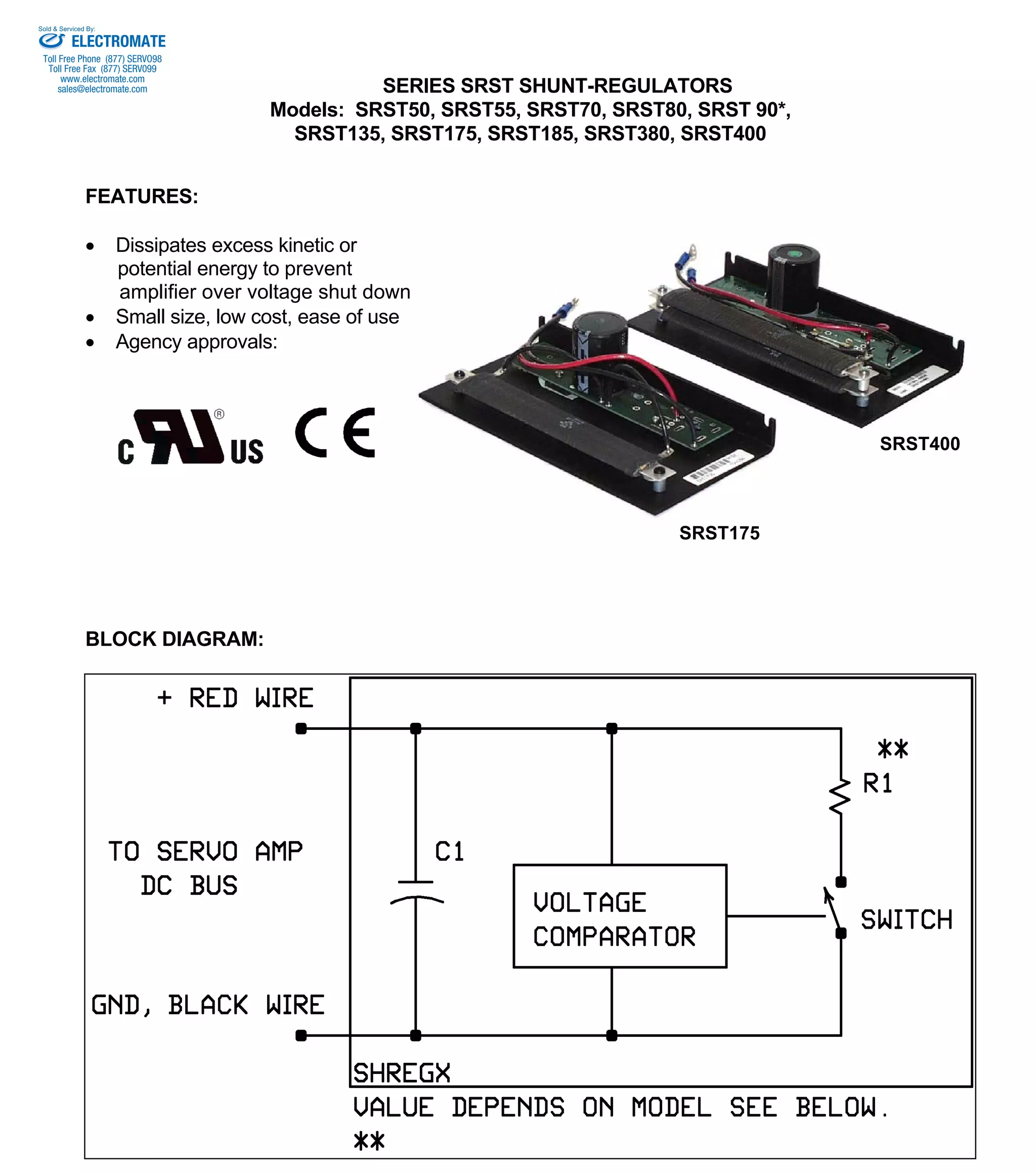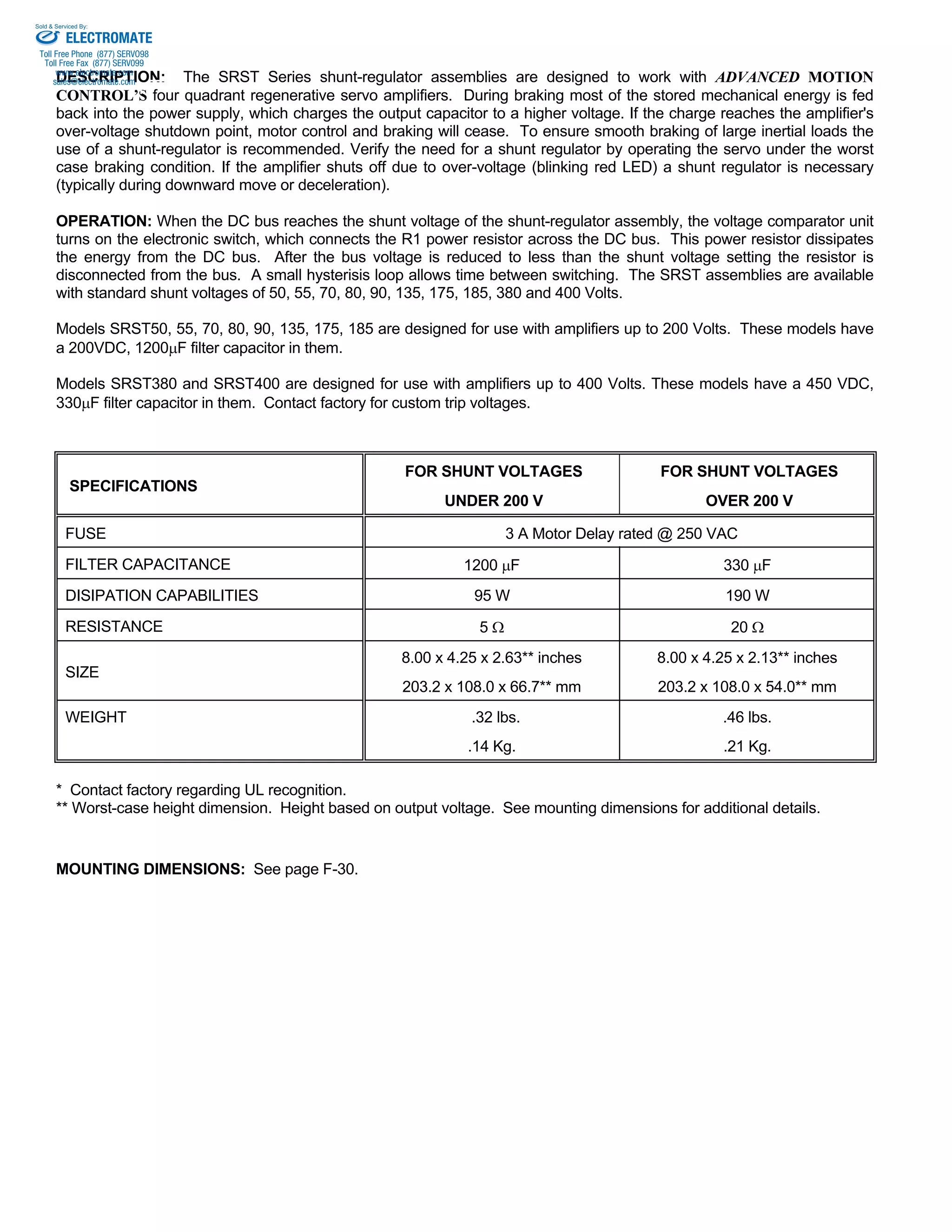 The document describes shunt regulator assemblies from the SRST Series that are designed to work with ADVANCED MOTION CONTROL's four quadrant regenerative servo amplifiers. The shunt regulators dissipate excess energy during braking to prevent the amplifier from shutting down due to overvoltage. Models of the shunt regulators are available with standard shunt voltages ranging from 50 to 400 volts. The shunt regulators ensure smooth braking of large inertial loads by dissipating energy from the DC bus when the voltage reaches the shunt voltage setting.