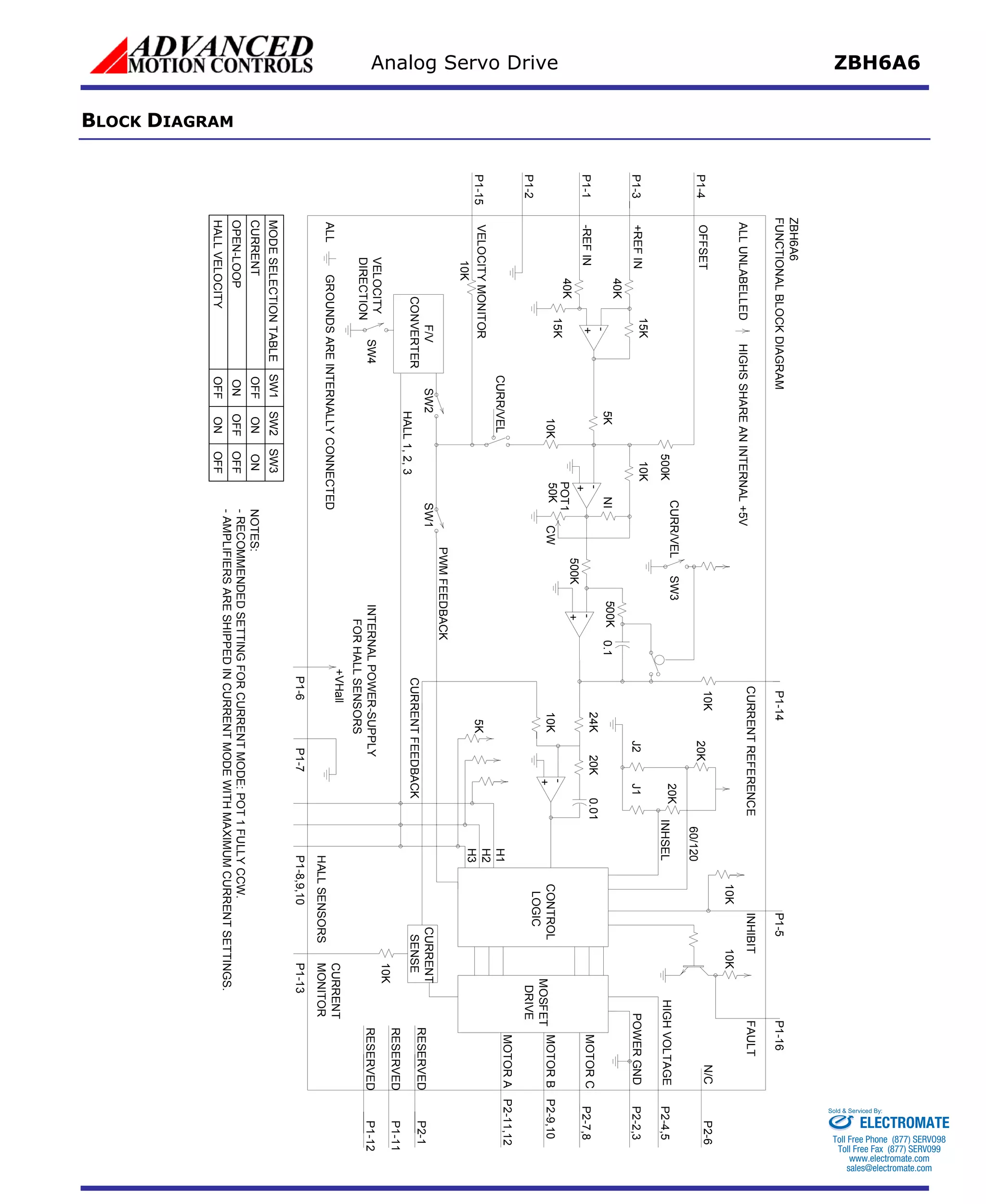The ZBH6A6 analog servo drive is designed to drive brushless DC motors with a peak current of 6A. It has hall sensor commutation and accepts a ±10V analog input signal. It provides status outputs for current, velocity, and faults.