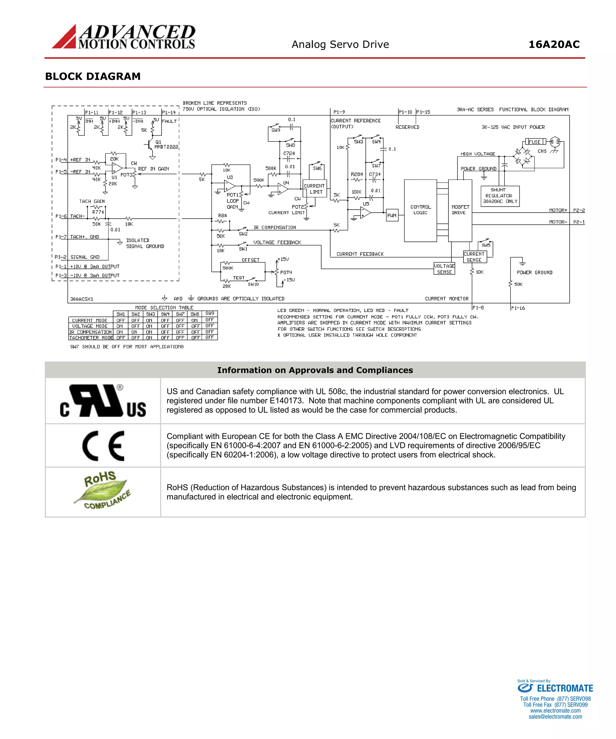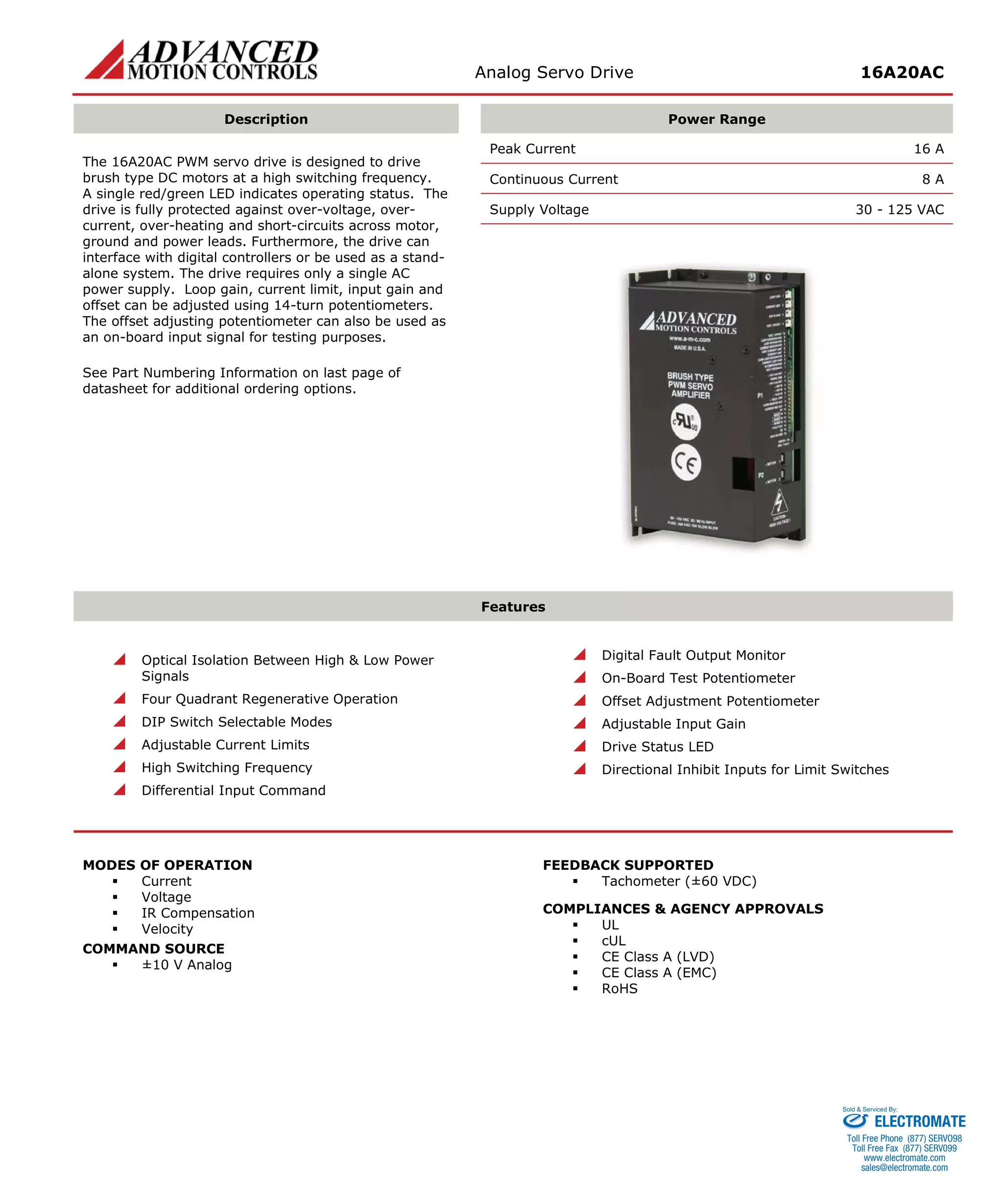 The document describes an analog servo drive that can drive DC motors. It provides peak and continuous current ratings of 16A and 8A respectively. It has features like adjustable current limits, high switching frequency, and fault monitoring. It can interface with digital controllers or operate standalone, and supports modes like current, voltage, and velocity control.