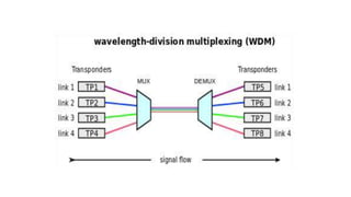 The document discusses advanced multiplexing technologies used in optical fiber communication, including Time Division Multiplexing (TDM), Wavelength Division Multiplexing (WDM), Optical Time Division Multiplexing (OTDM), and Subcarrier Multiplexing (SCM). These techniques maximize information transfer by allowing multiple signals to be sent simultaneously over a single fiber link. Applications include long-distance optical networks, increasing existing network capacity, and capacity leasing.