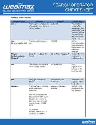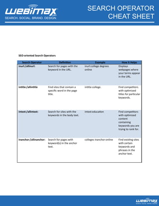 This document provides a summary of various search operators that can be used to refine Google searches. It lists operators for searching by URL, title, text, anchor text, file type, domain, and more. Boolean operators like AND, OR and NOT are described, as are proximity operators. The document also gives examples of how each operator can help with search and provides time and location-based operators.