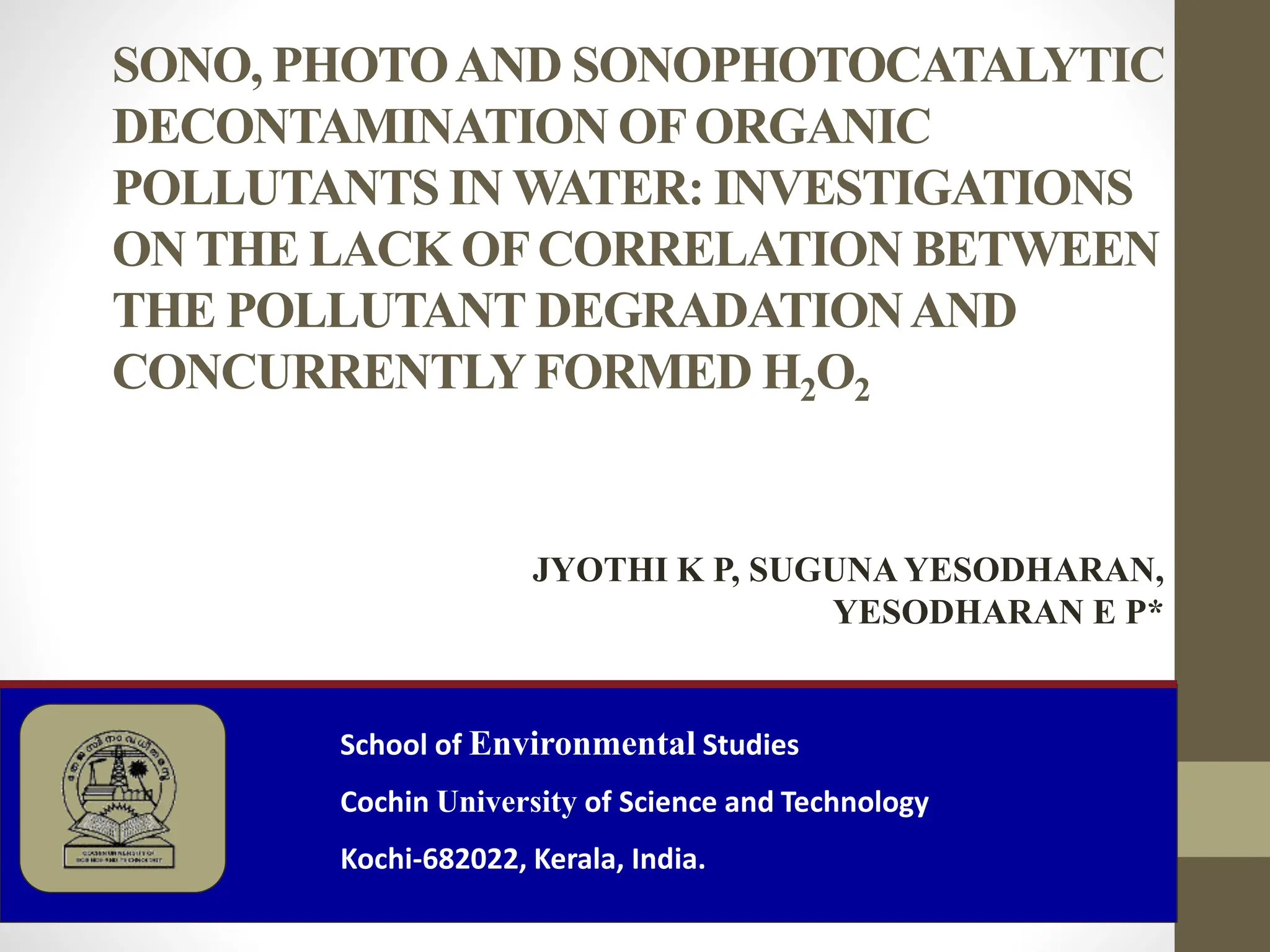 This document investigates the lack of correlation between the degradation of organic pollutants and the concurrently formed hydrogen peroxide (H2O2) during sono, photo, and sonophotocatalytic processes. It finds that sono, photo, and sonophotocatalytic degradation of phenol generates H2O2 as an intermediate and final product. The concentration of H2O2 oscillates during sono and photocatalysis due to competing formation and decomposition, while it stabilizes during sonophotocatalysis. The oscillations depend on concentration, with formation or decomposition dominating at times, causing concentration increases or decreases. In the absence of sufficient oxygen, H2O2 acts as