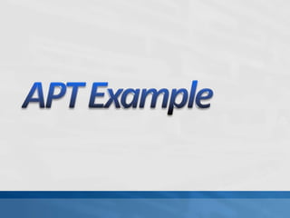 This document discusses advanced persistent threats (APTs). It defines APTs, describes their stages including reconnaissance, delivery, exploitation, operation, data collection, and exfiltration. It then presents an APT detection framework called the Attack Pyramid that models APT attacks across physical, user access, network, and application planes and detects relevant events using algorithms and rules. Research papers are cited that further define APTs and propose the Attack Pyramid model for detecting such threats.