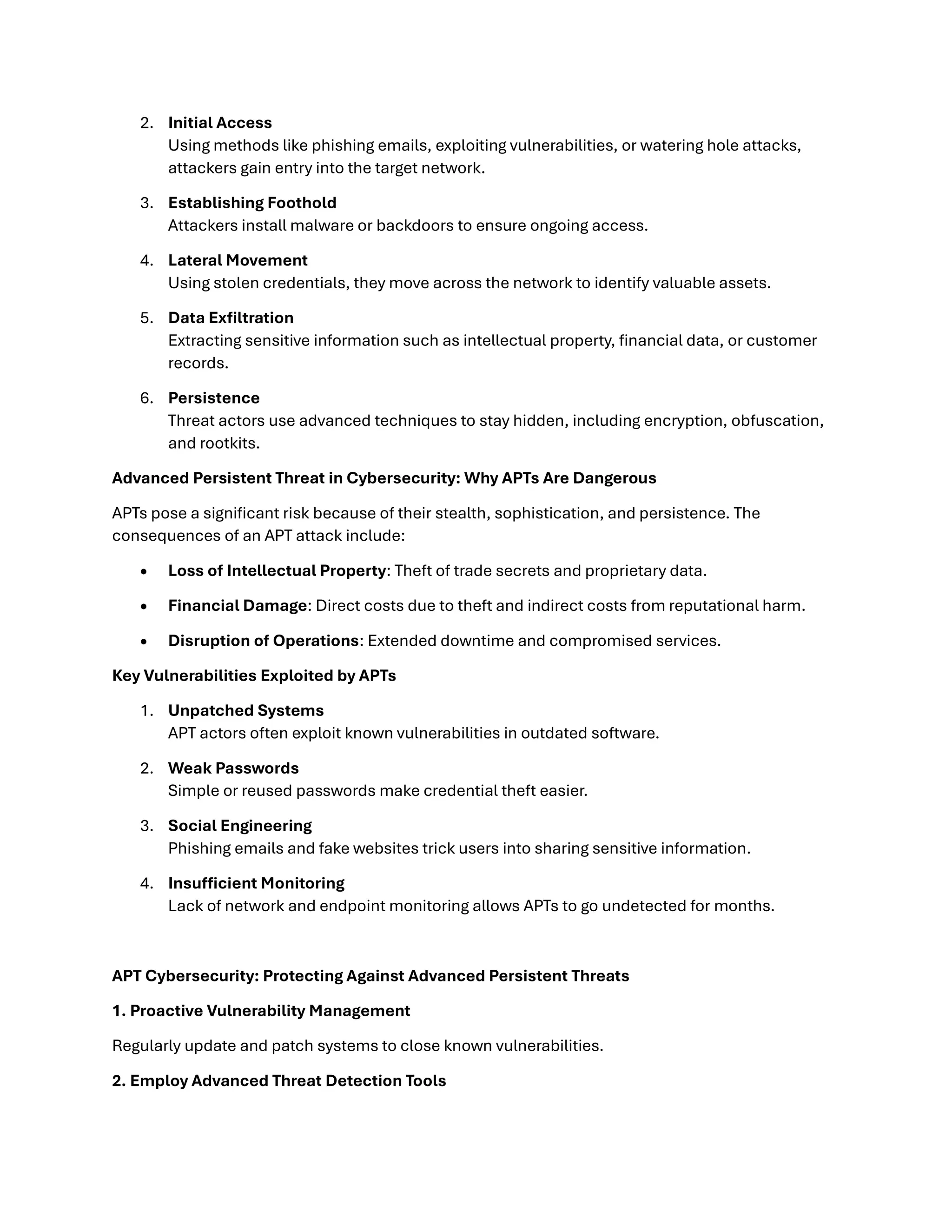 Advanced Persistent Threats (APTs) are targeted, stealthy cyberattacks designed to infiltrate and extract sensitive data from organizations, particularly those dealing with valuable information. They follow a systematic lifecycle involving reconnaissance, initial access, establishing footholds, lateral movement, data exfiltration, and persistence, making them a significant cybersecurity challenge. To defend against APTs, organizations should focus on proactive vulnerability management, advanced threat detection tools, employee training, network segmentation, and continuous monitoring.