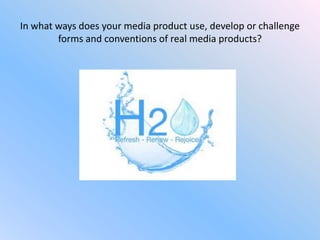 Hannah analyzed the forms and conventions of real beauty and skincare advertisements to develop a cohesive brand identity across her five advertisements. She used techniques like close-up shots, natural colors, slow pacing, and consistent music to match expectations. However, she also challenged some conventions like ending with the logo instead of a product shot. She chose to sponsor "Loose Women" because it aligned with her target audience and allowed daily exposure during primetime. For her radio advert, she employed techniques like rhetorical questions and sound effects while subverting some conventions like repetitive music.
